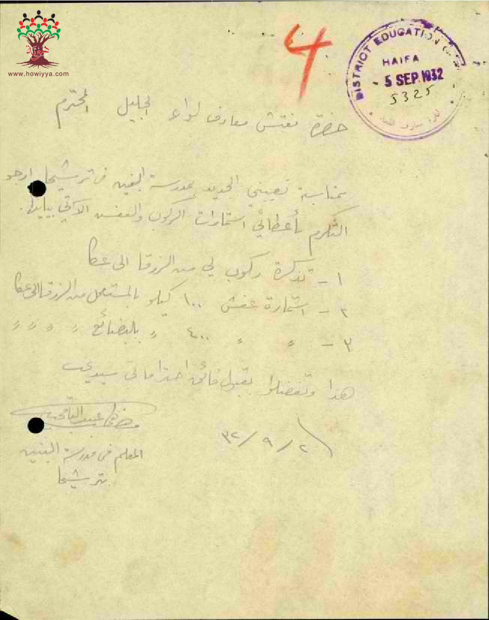 رسالة من المعلم مصطفى عبد الباقي الى مفتش المعارف يطلب فيها استمارة سفره السنوية
