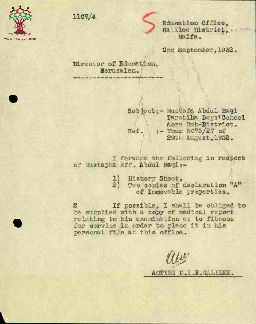 رسالة من مفتش المعارف الى مدير المعارف بخصوص أوراق تعيين المعلم مصطفى عبد الباقي في مدرسة ترشيحا
