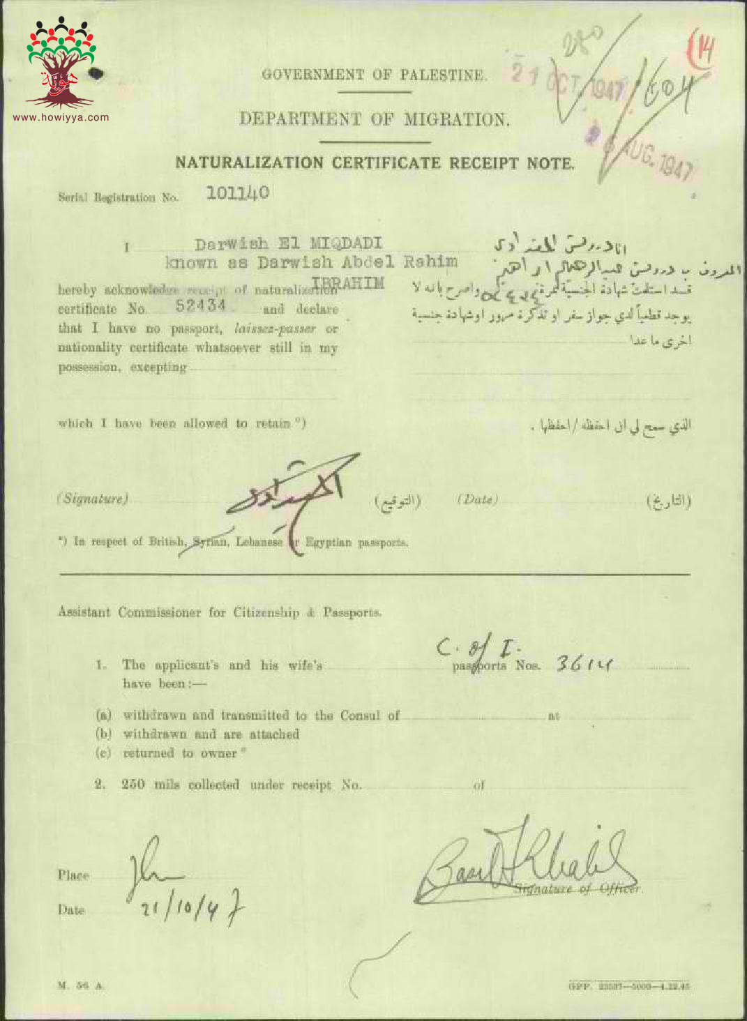 ايصال موقع من درويش المقدادي باستلام شهادة الجنسية الفلسطينية