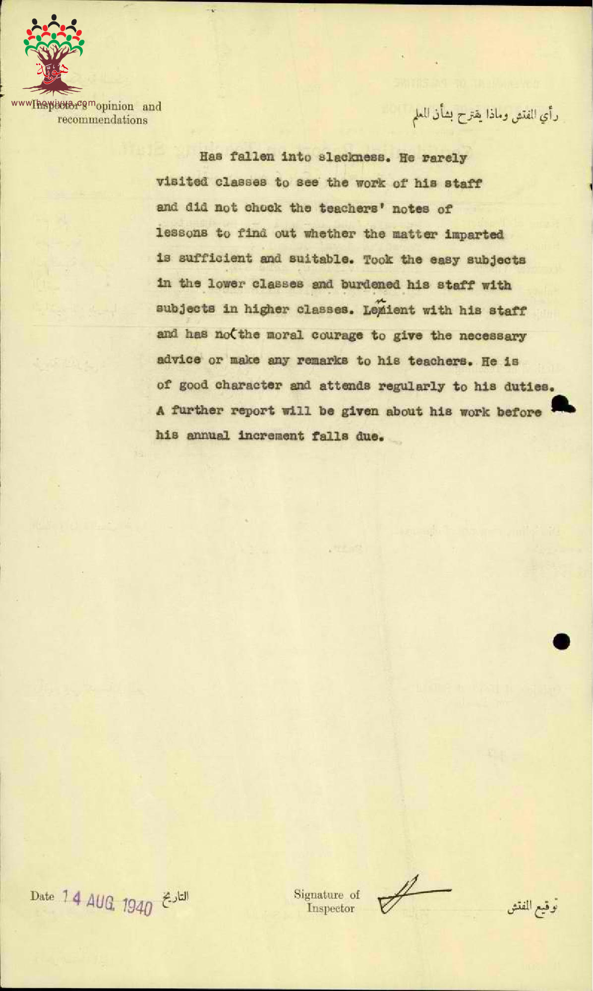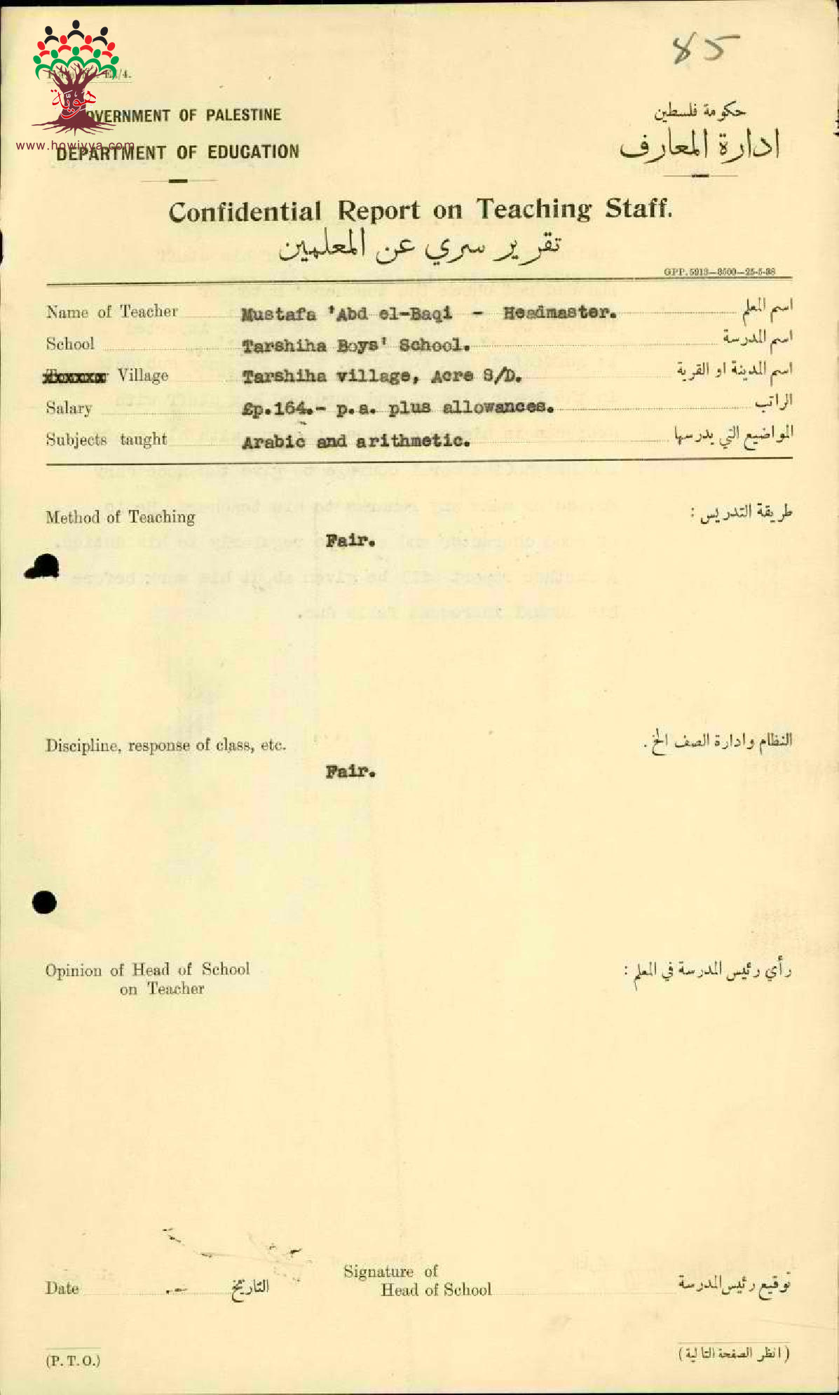 تقرير تفصيلي عن أداء المعلم مصطفى عبد الباقي في مدرسة ترشيحا سنة 1940