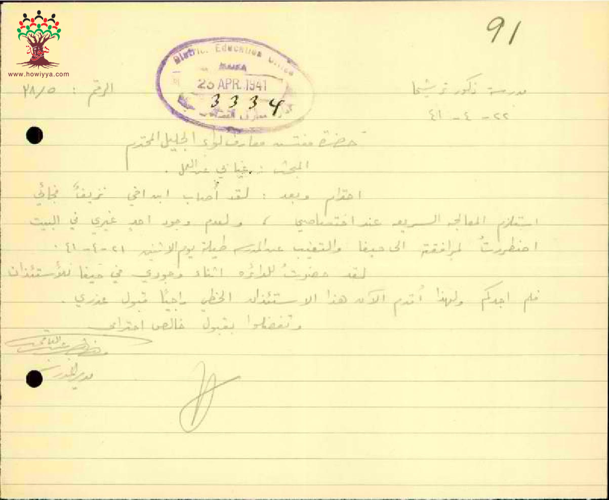 رسالة من المعلم مصطفى عبد الباقي الى مفتش المعارف بخصوص تغيبه عن العمل بسبب مرضه