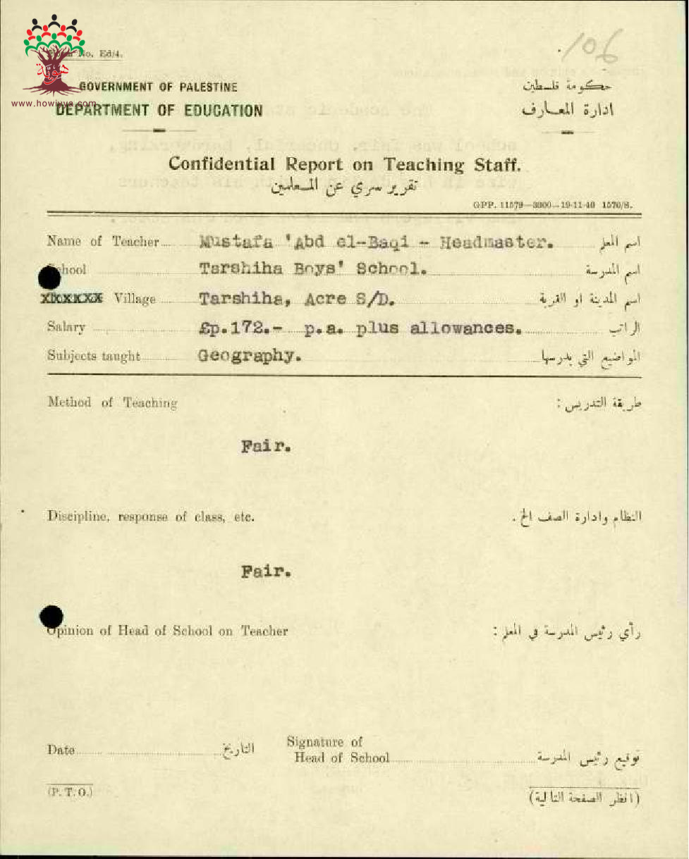 تقرير تفصيلي عن أداء المعلم مصطفى عبد الباقي في مدرسة ترشيحا سنة 1945