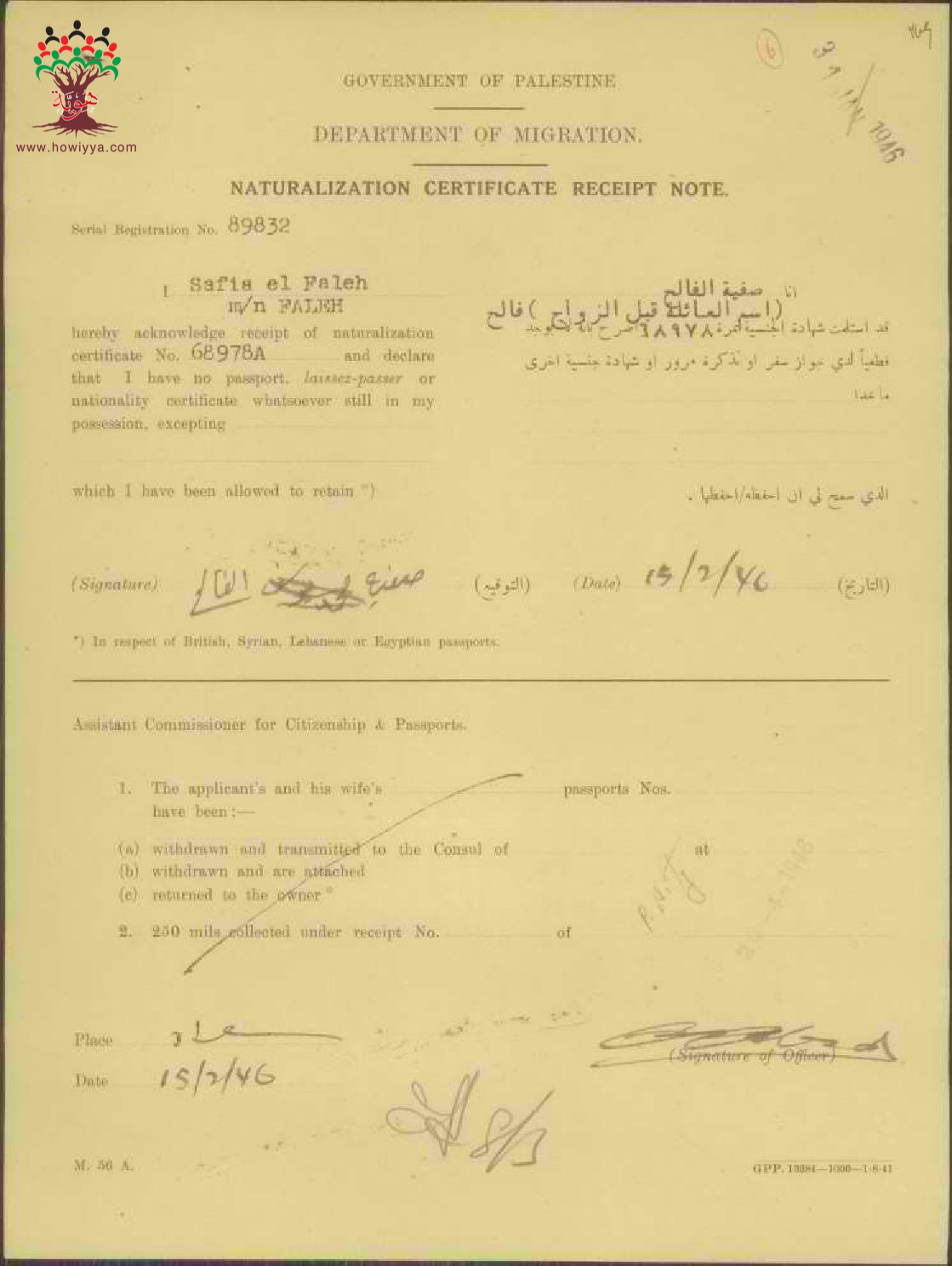 ايصال موقع من صفية الفالح باستلام شهادة الجنسية الفلسطينة