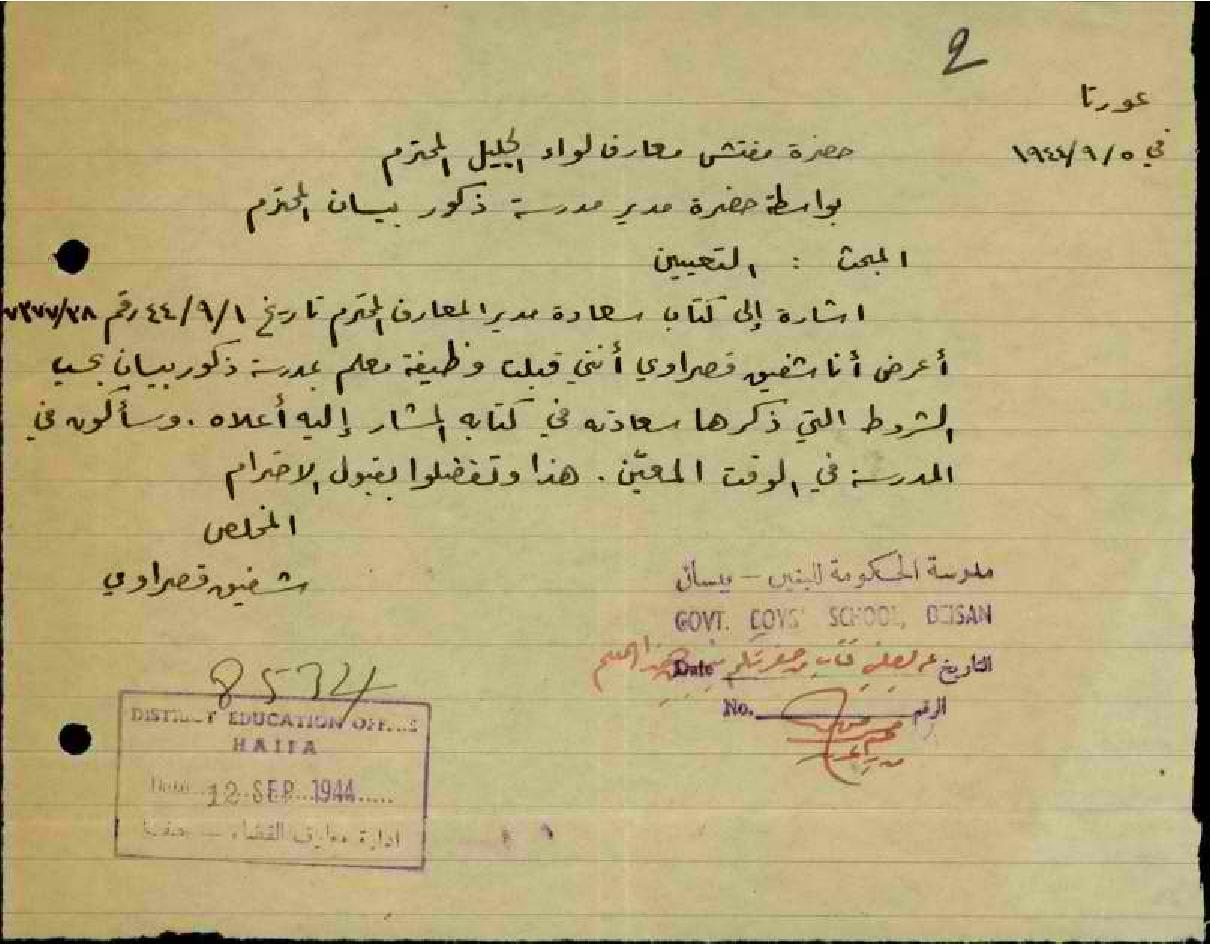 رسالة من المعلم شفيق قصراوي الى مفتش المعارف يقبل فيها مركز معلم في مدرسة بيسان