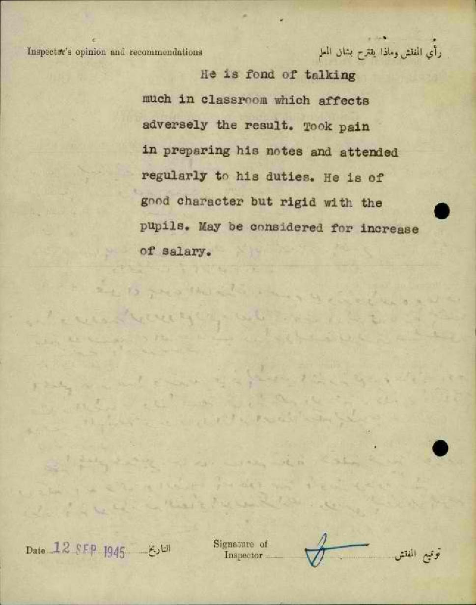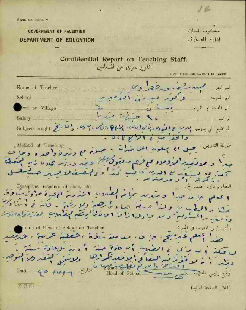 تقرير تفصيلي عن أداء المعلم شفيق قصراوي في مدرسة بيسان للبنين سنة 1945
