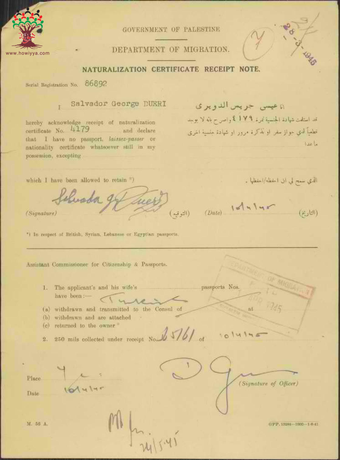 ايصال موقع من عيسى جريس الدويري باستلام شهادة الجنسية الفلسطينية