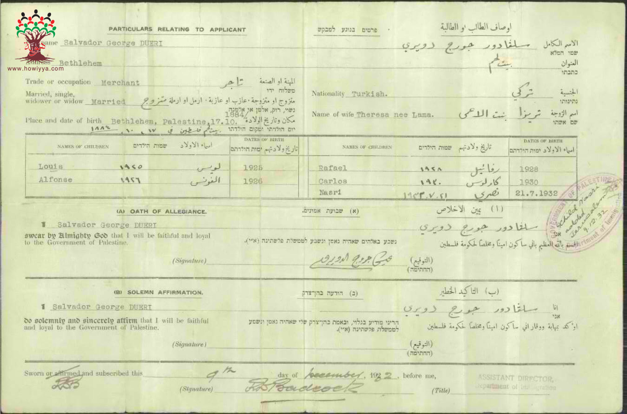 شهادة الجنسية الفلسطينية لعيسى جريس الدويري