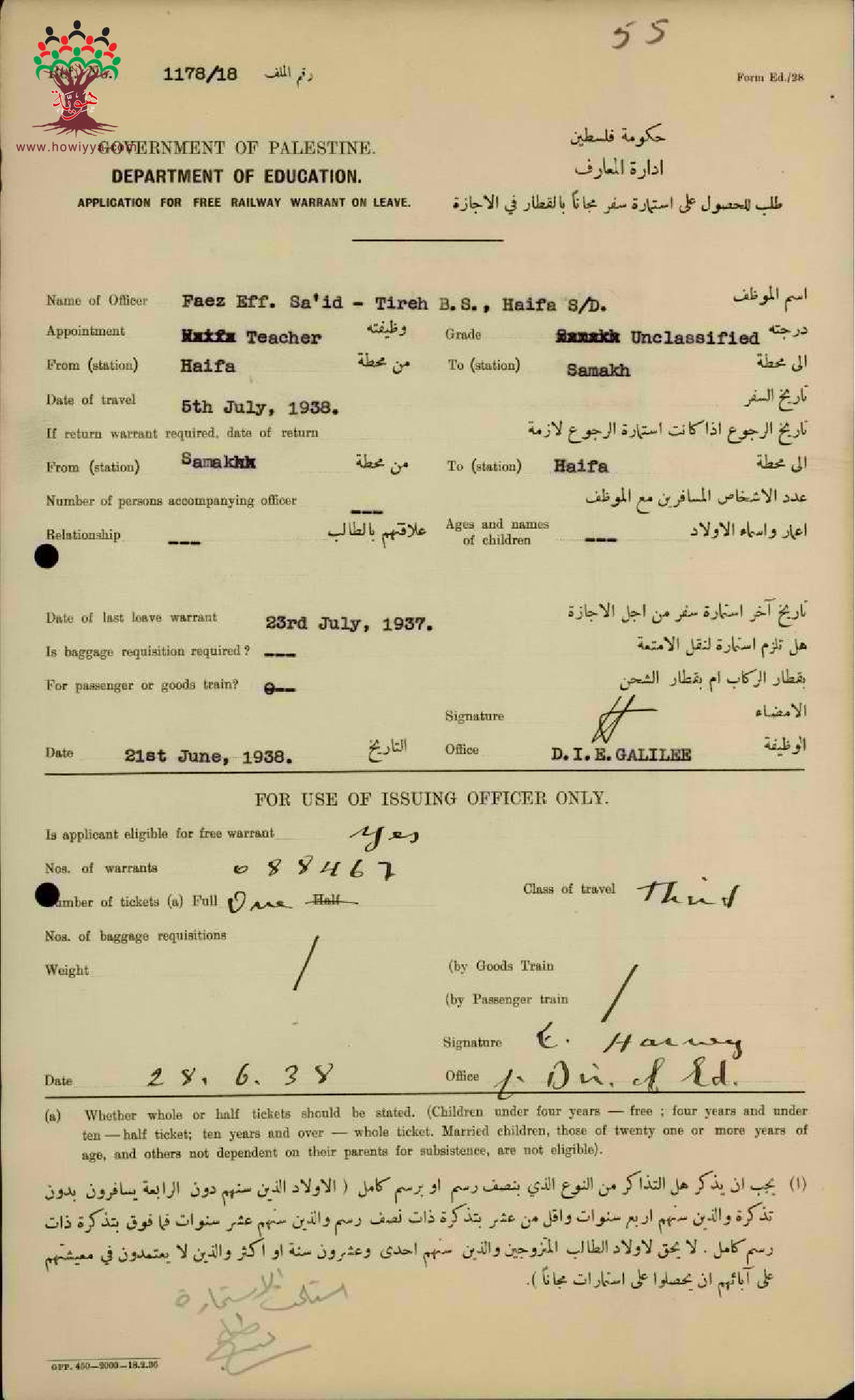 طلب استمارة سفر مقدمة من المعلم فايز سعيد/القيسارية