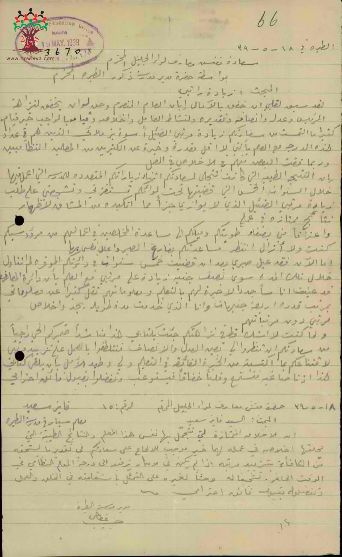 رسالة من المعلم فايز سعيد الى مفتش المعارف يطالب بزيادة راتبه