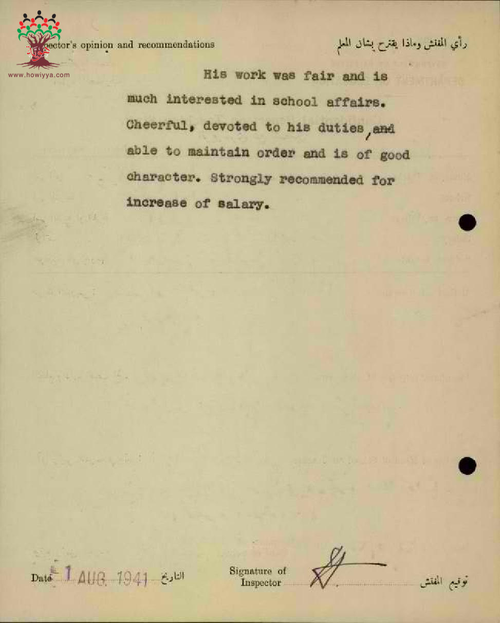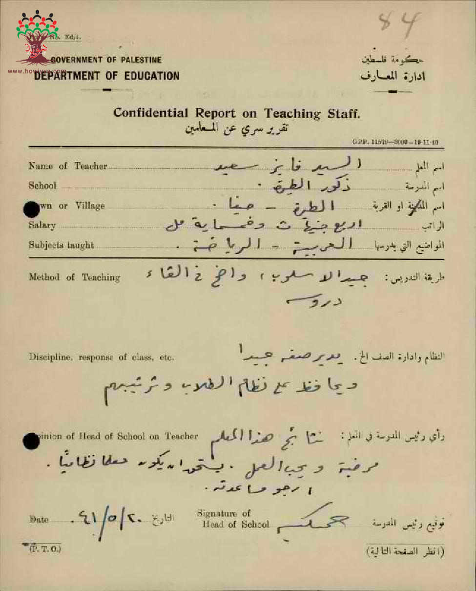 تقرير تفصيلي عن أداء المعلم فايز سعيد في مدرسة الطيرة سنة 1941