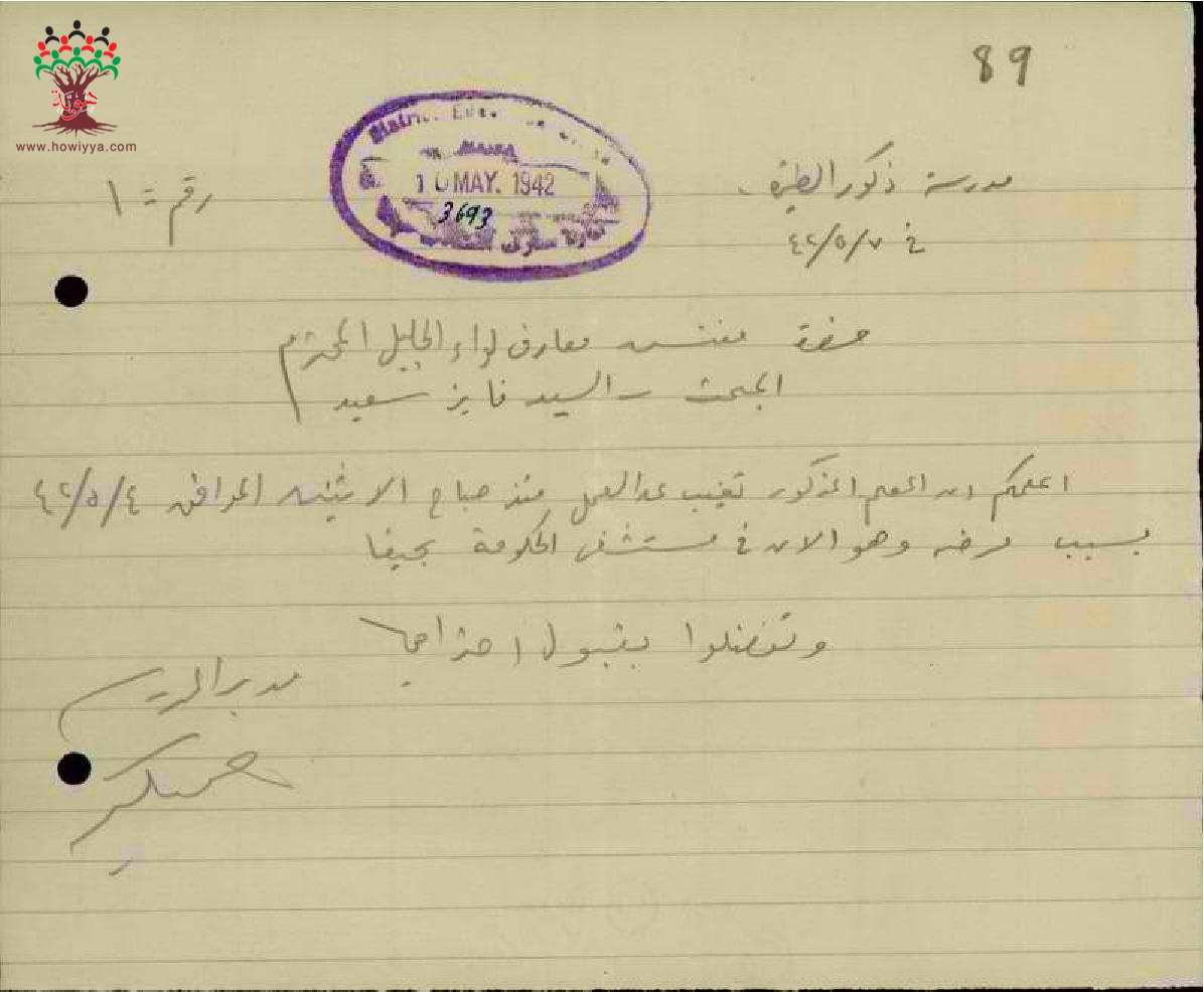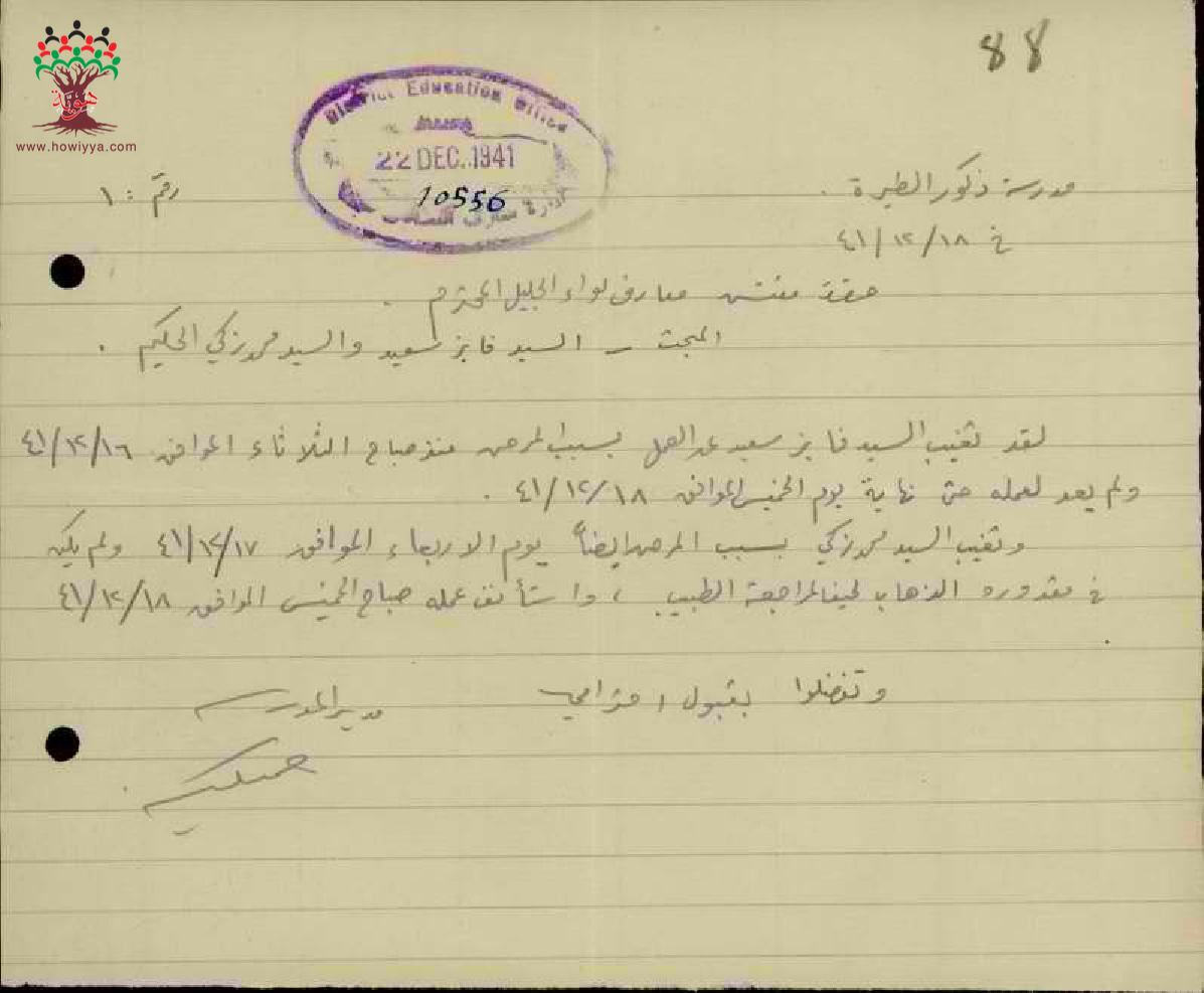 رسائل من مدير مدرسة الطيرة الى مفتش المعارف بخصوص تغيب المعلم فايز سعيد وعودته الى العمل