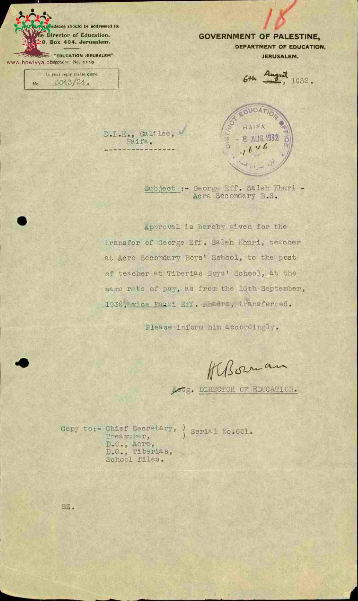 رسالة من مدير المعارف الى مفتش المعارف بخصوص الموافقة على نقل المعلم جورج خوري من مدرسة عكا الى مدرسة طبريا
