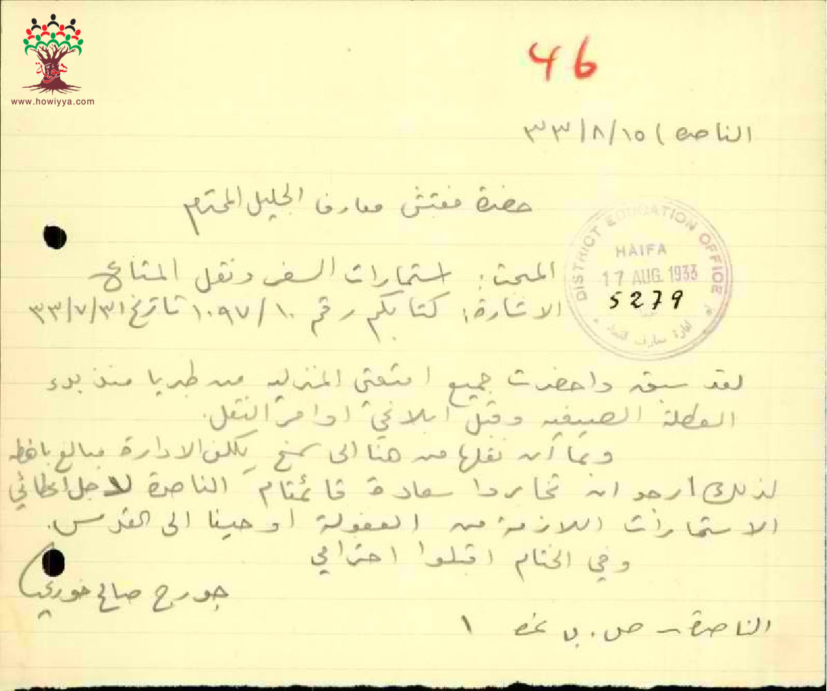 رسالة من المعلم جورج خوري الى مفتش المعارف يطلب استمارة نقله