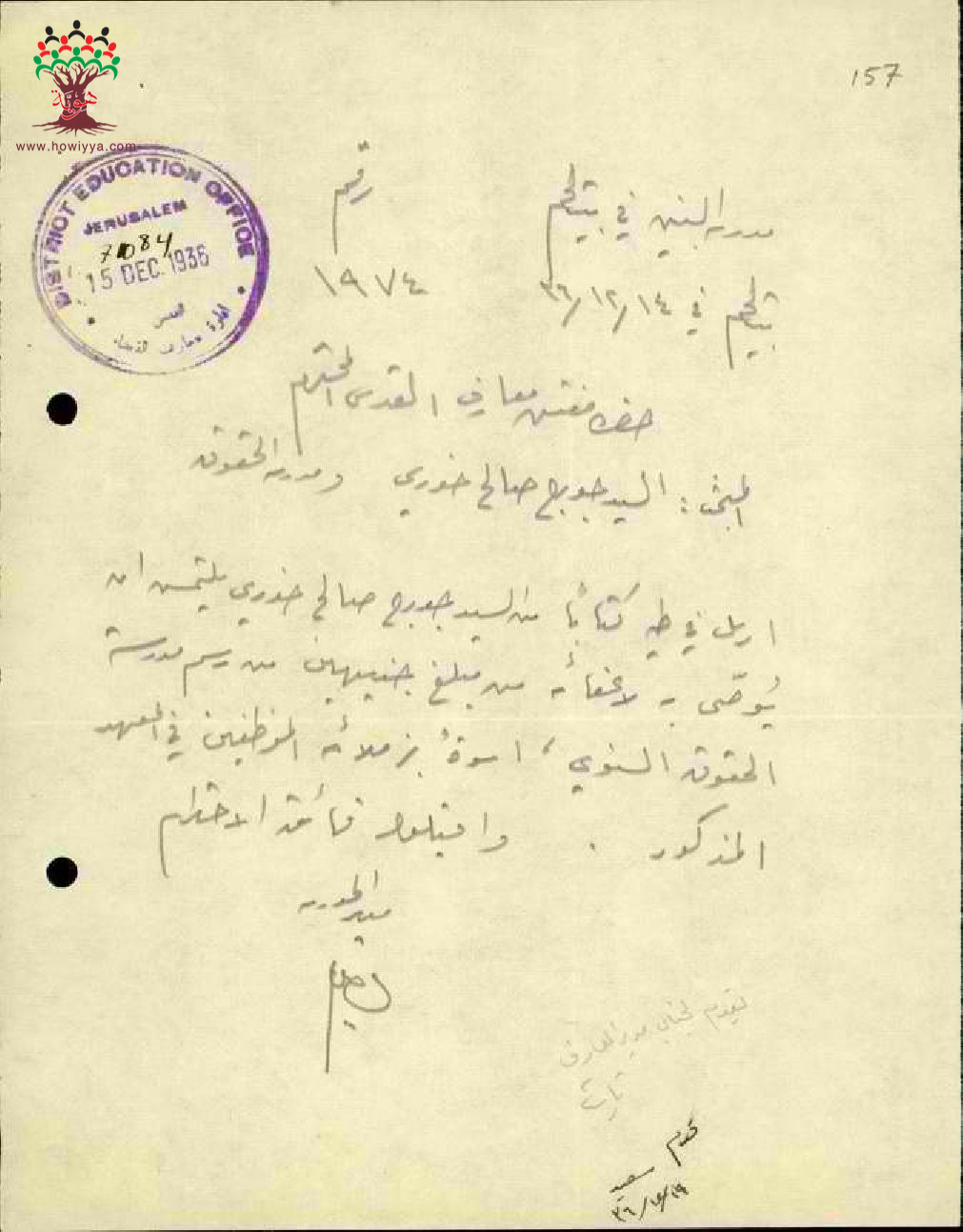 رسالة من مدير مدرسة بيت لحم الى مفتش المعارف بخصوص طلب المعلم جورج خوري لإعفائه من رسم مدرسة الحقوق السنوي