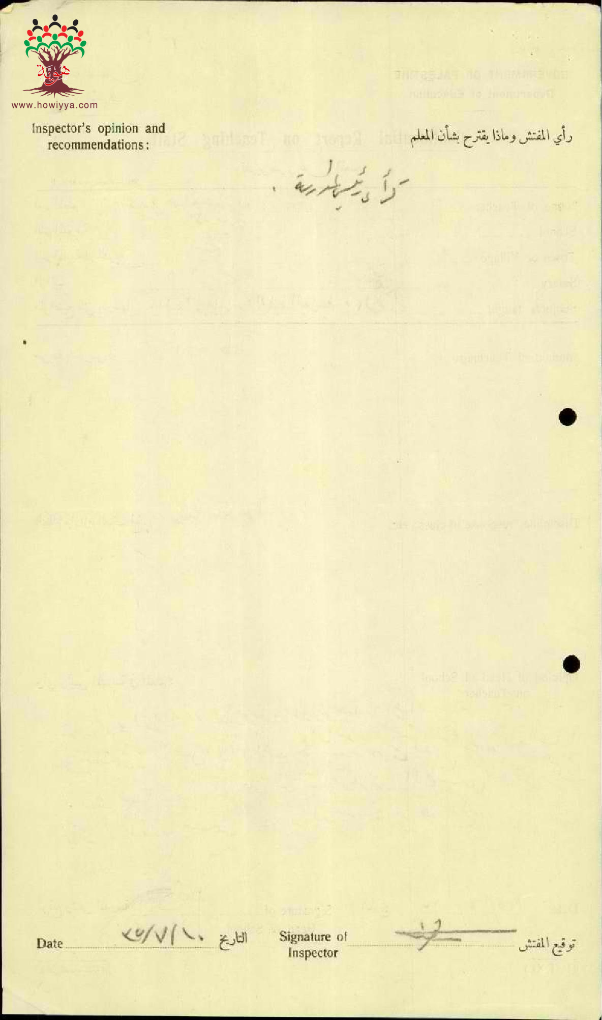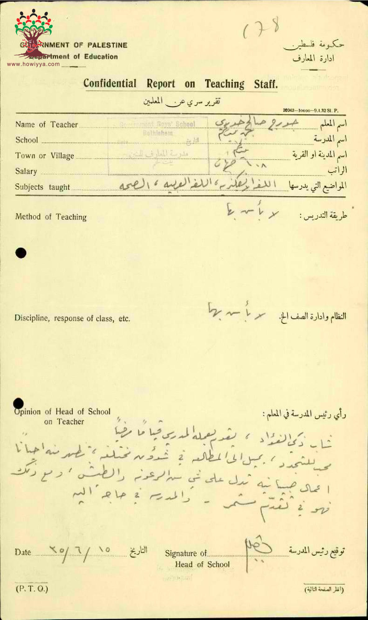 تقرير تفصيلي عن أداء المعلم جورج صالح خوري في مدرسة بيت لحم سنة 1935