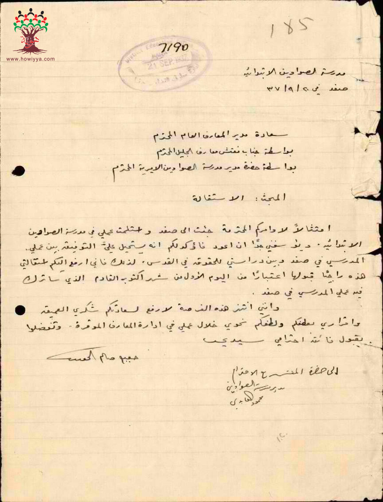 رسالة من المعلم جورج خوري الى مفتش المعارف يقدم فيها استقالته