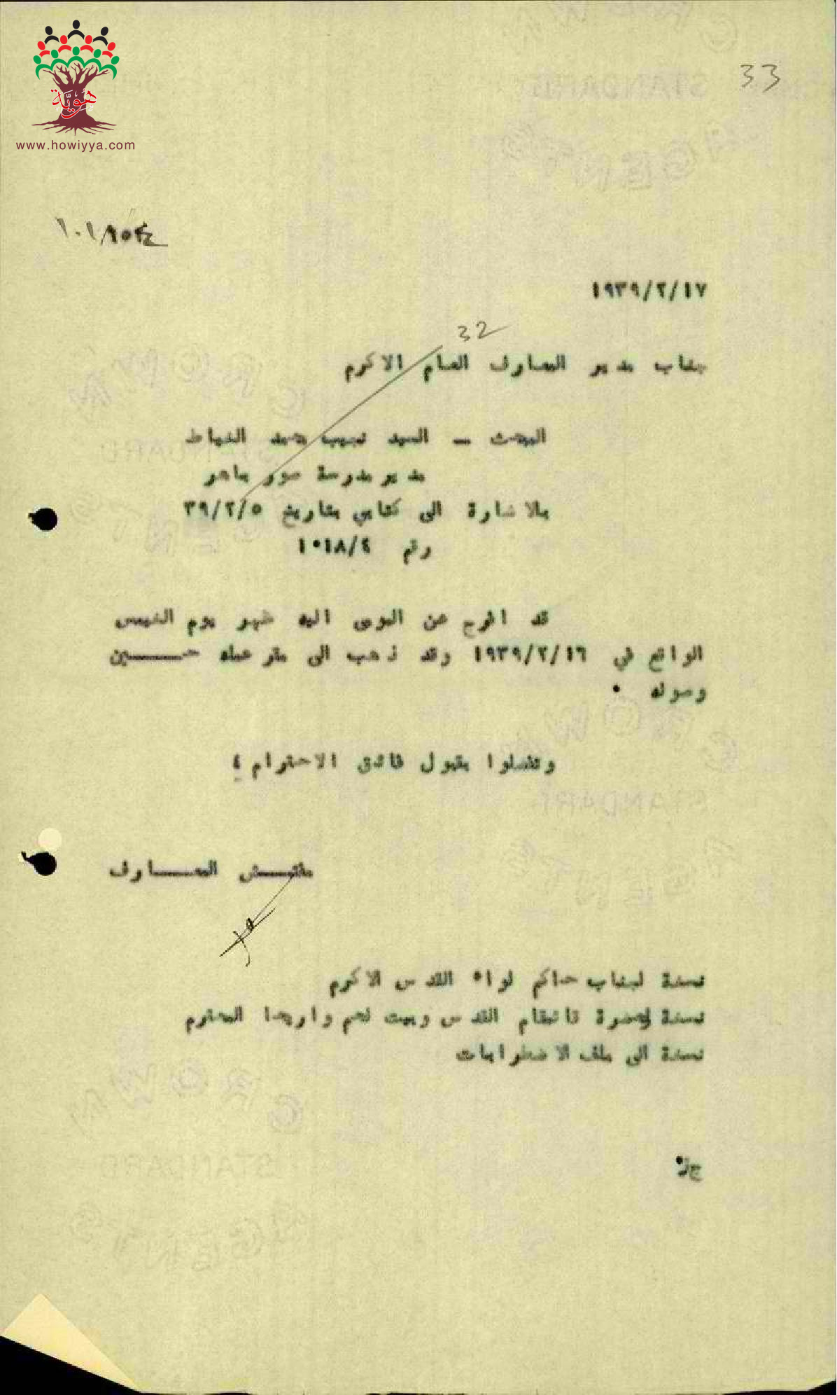 رسالة من مفتش المعارف الى مدير المعارف بخصوص الافراج عن المعلم نجيب الخياط