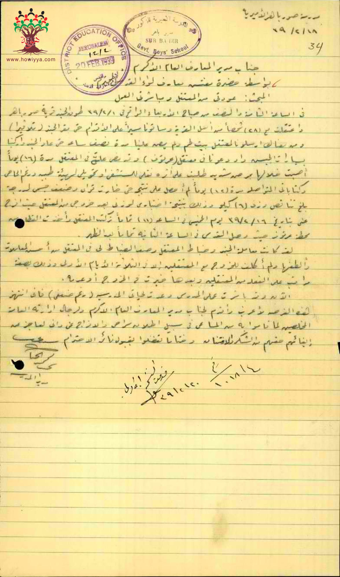 رسالة من المعلم نجيب الخياط الى مفتش المعارف بخصوص خروجه من المعتقل وعودته الى العمل