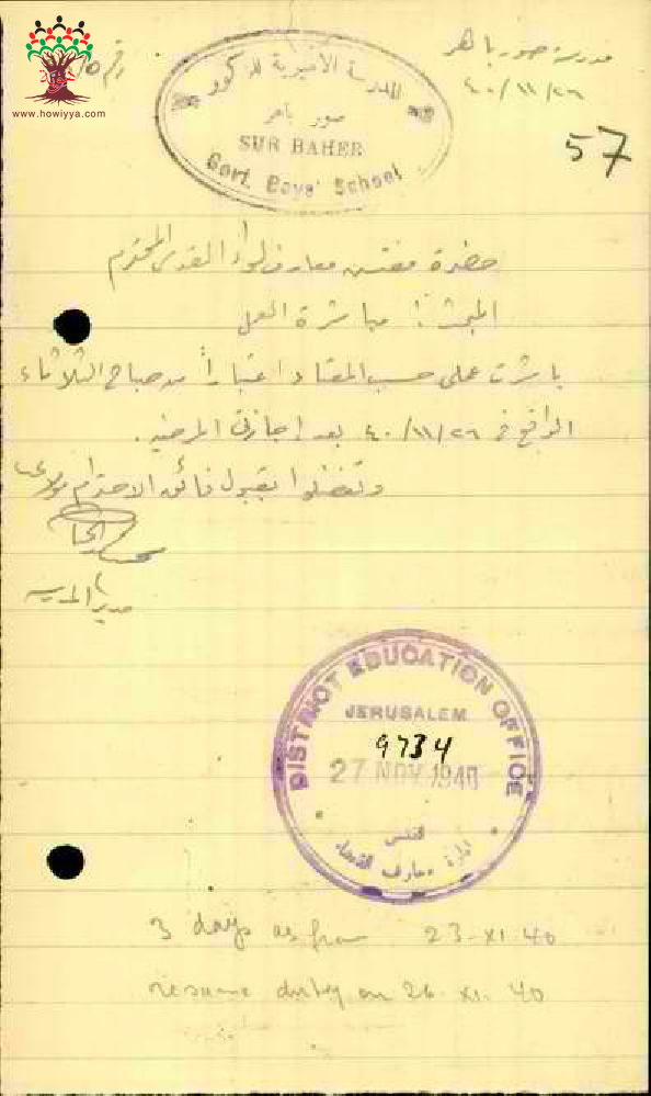 رسالة من المعلم نجيب الخياط الى مفتش المعارف يخبره بأنه قد باشر عمله