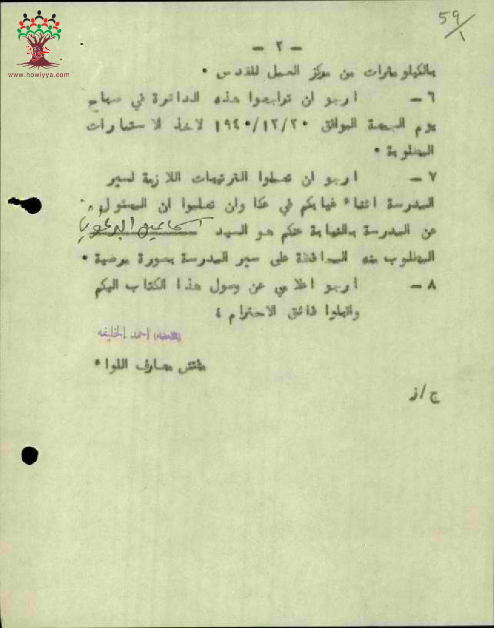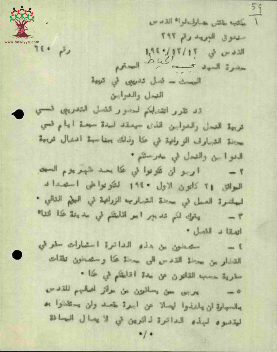 رسالة من مفتش المعارف الى المعلم نجيب الخياط بخصوص انتخابه لحضور الفصل التدريبي في تربية النحل والدواجن