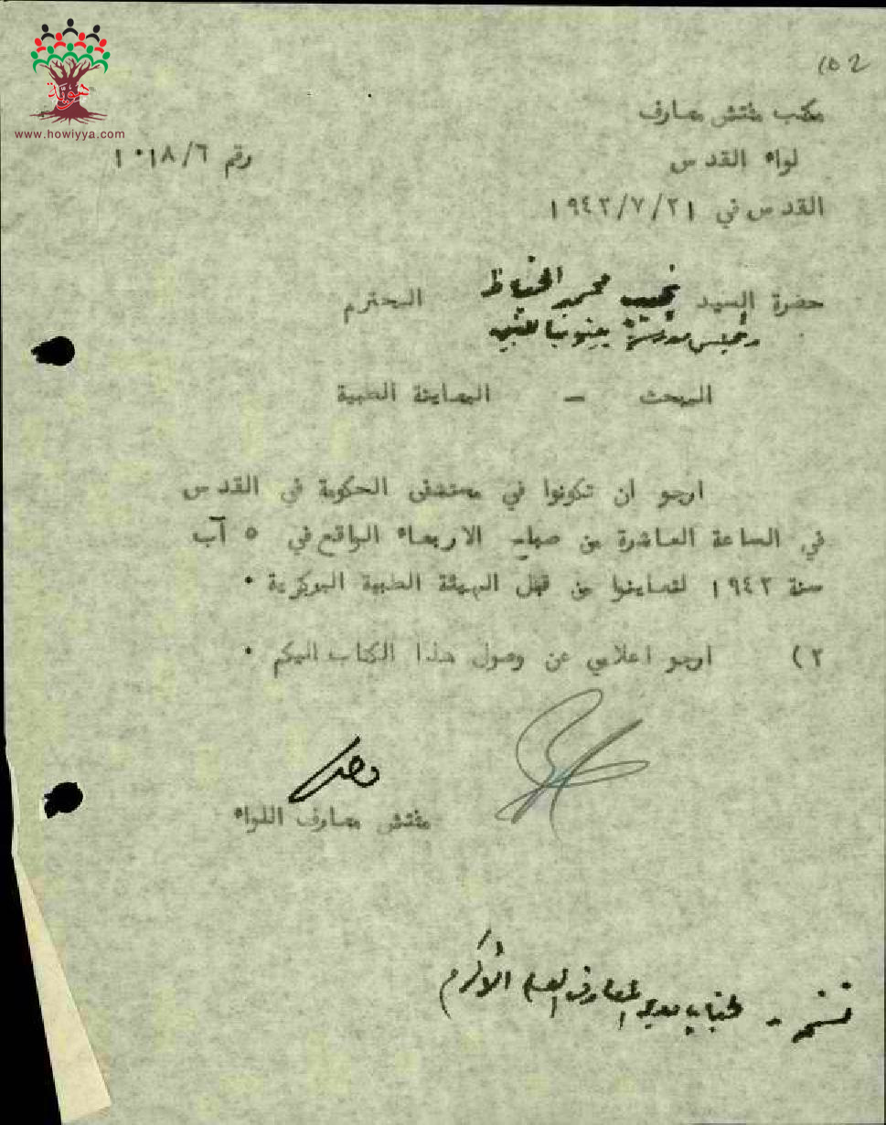 رسالة من مفتش المعارف الى المعلم نجيب الخياط للذهب الى المعاينة الطبية
