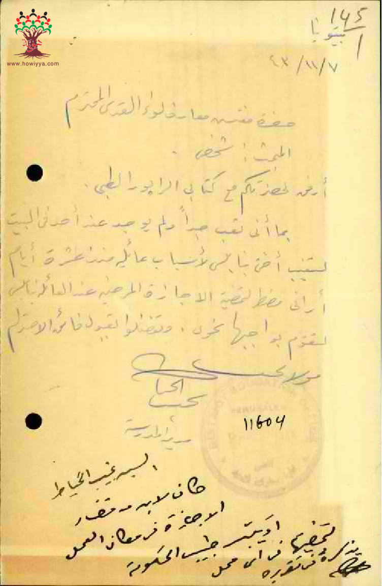 رسالة من المعلم نجيب الخياط الى مفتش المعارف يطلب قضاء اجازته المرضية في نابلس
