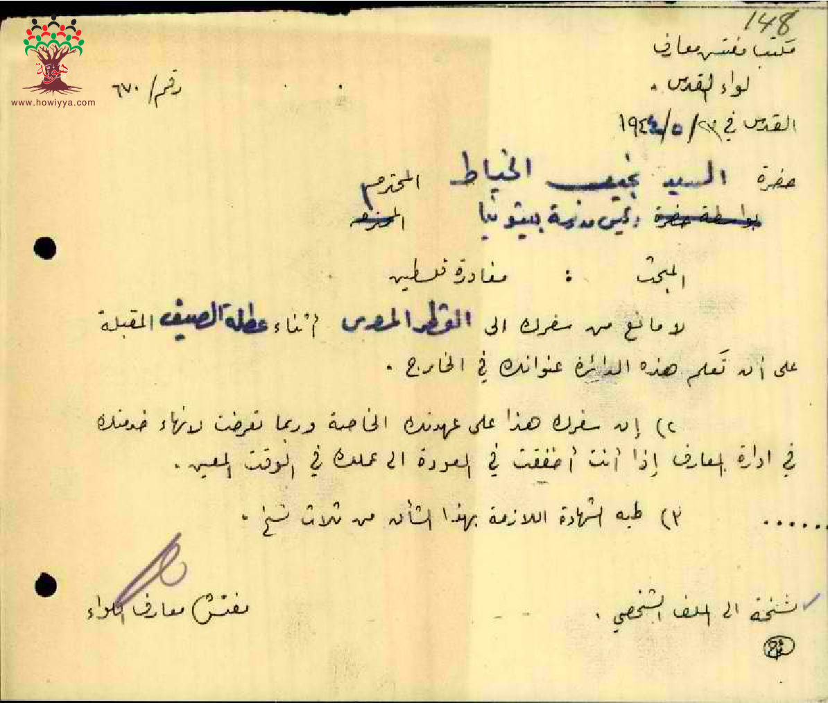 رسالة من مفتش المعارف الى المعلم نجيب الخياط يسمح له بالسفر أثناء عطلة الصيف