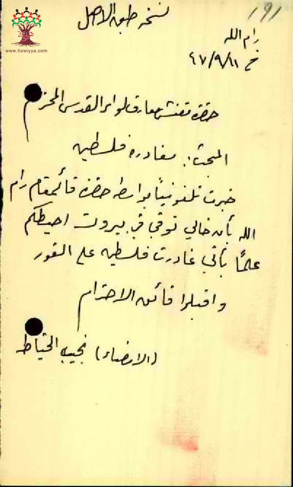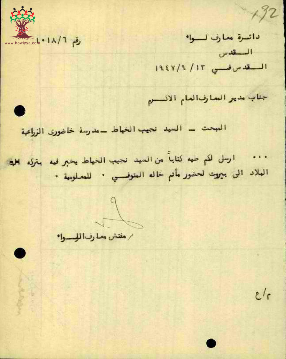 رسائل بخصوص تغيب المعلم نجيب الخياط وسفره الى بيروت بسبب وفاة خاله
