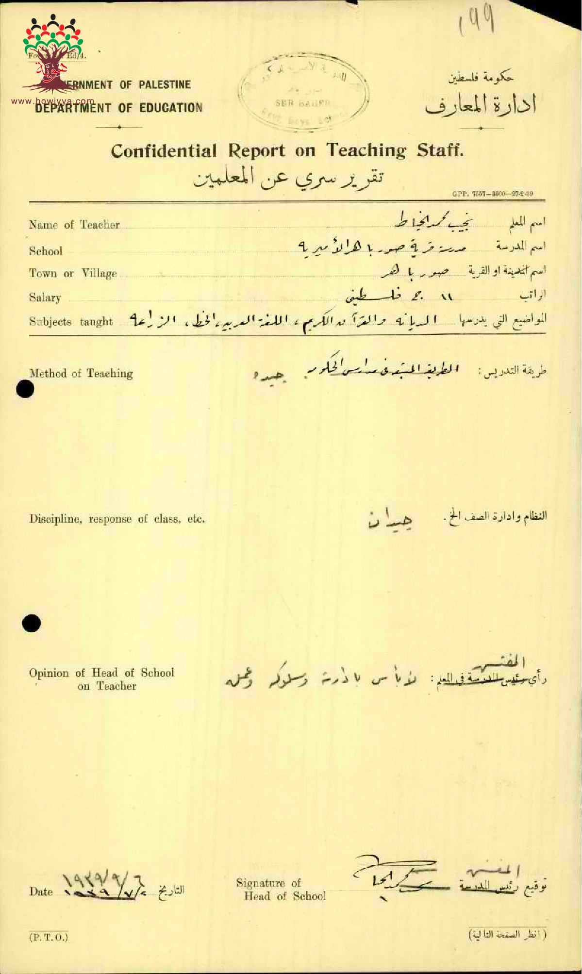 تقرير تفصيلي عن أداء المعلم نجيب محمد الخياط في مدرسة صور باهر سنة 1939