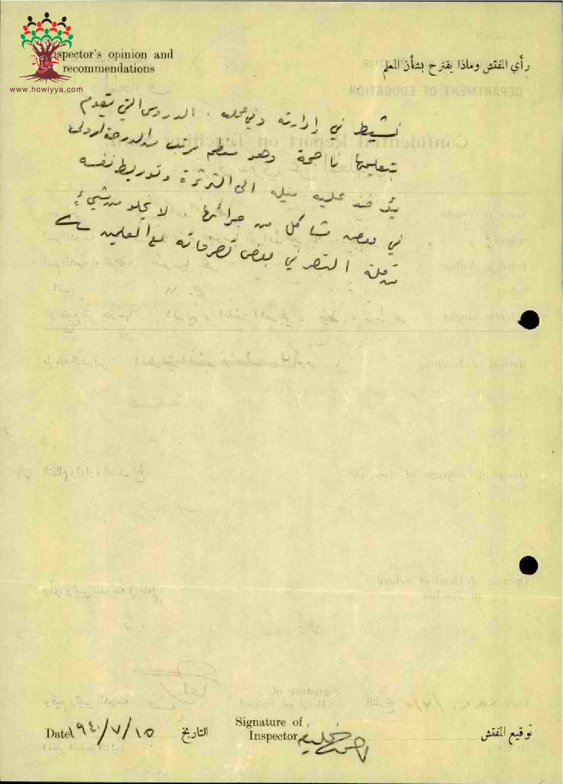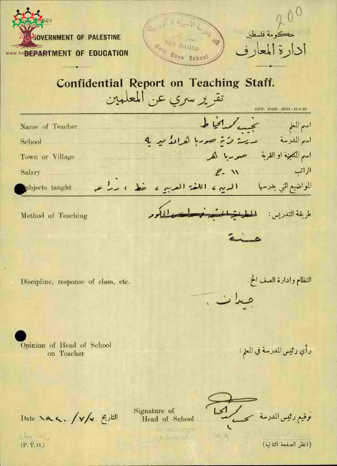 تقرير تفصيلي عن أداء المعلم نجيب محمد الخياط في مدرسة صور باهر سنة 1940