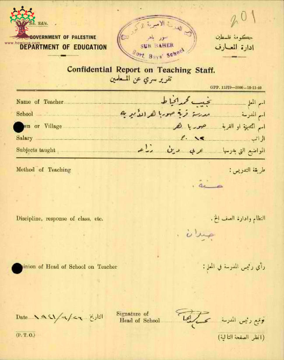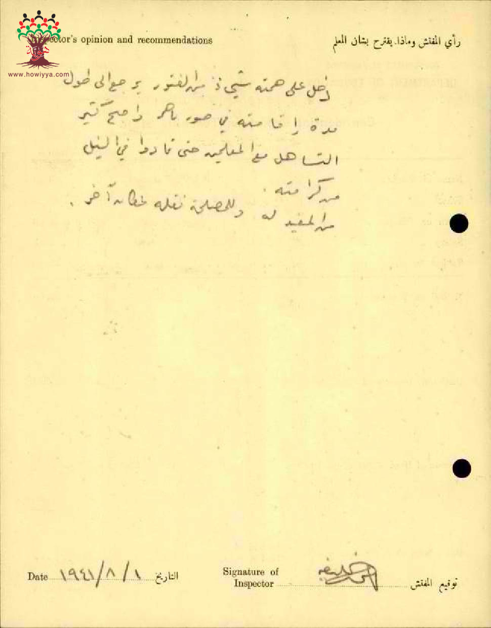 تقرير تفصيلي عن أداء المعلم نجيب محمد الخياط في مدرسة صور باهر سنة 1941