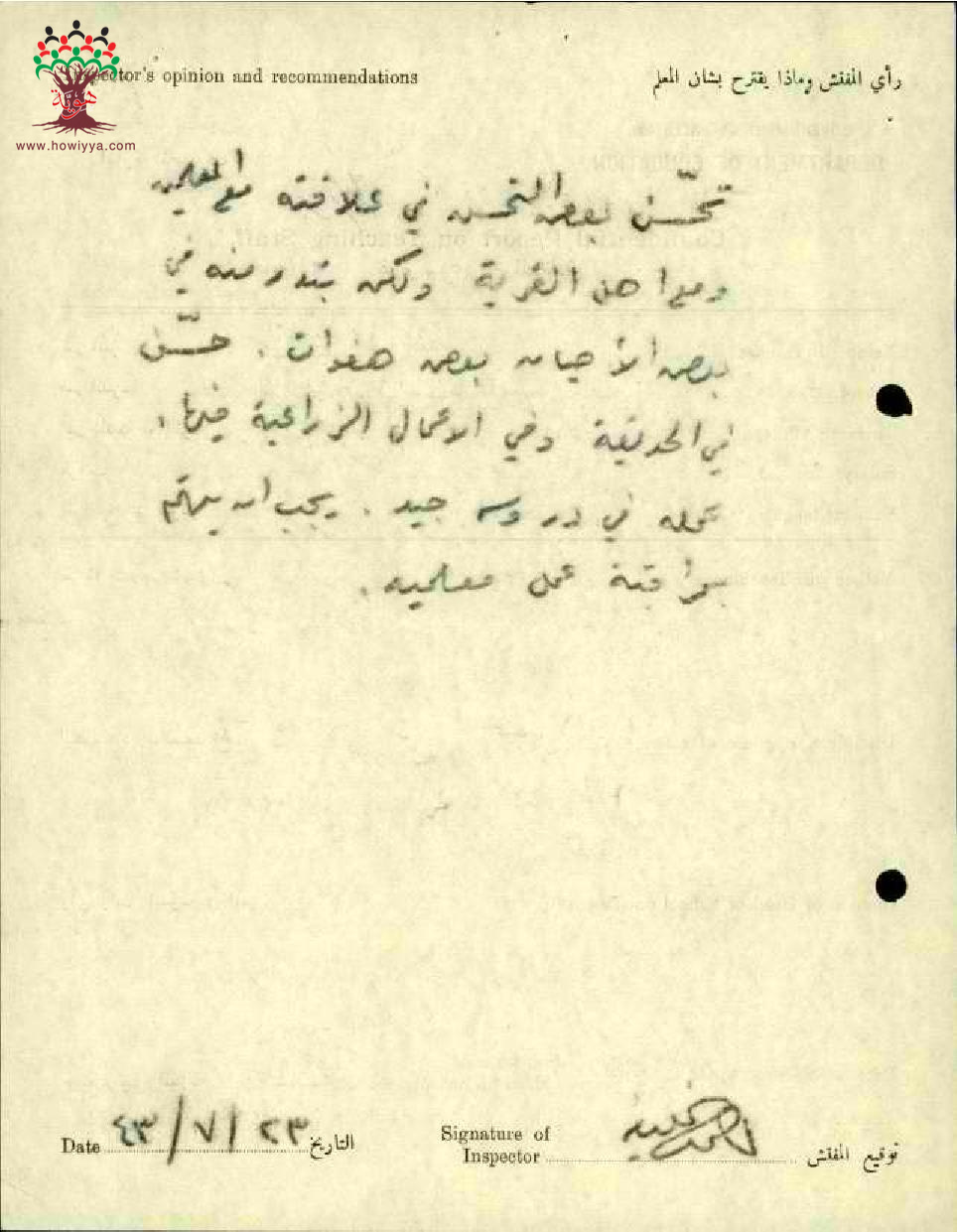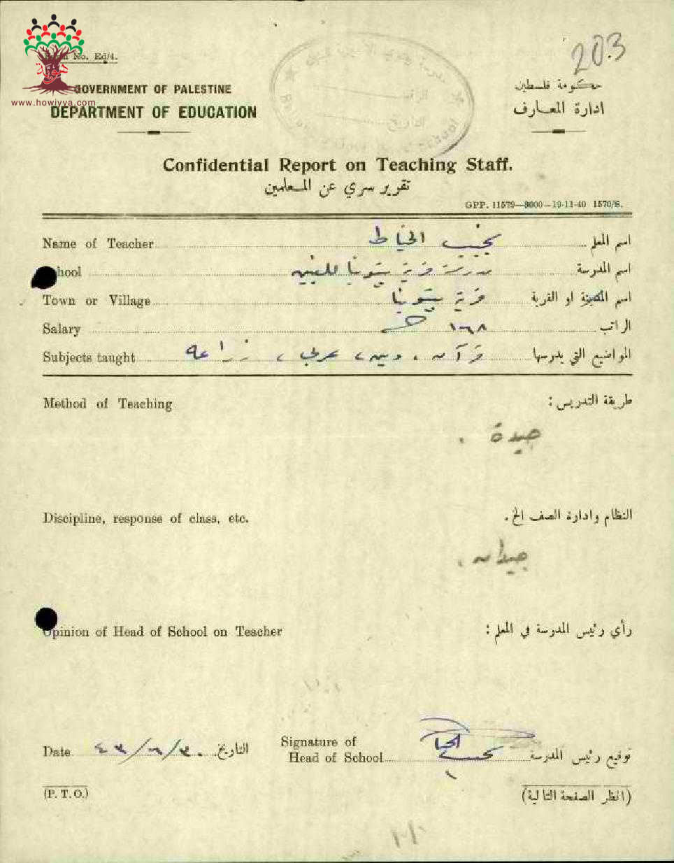 تقرير تفصيلي عن أداء المعلم نجيب محمد الخياط في مدرسة بيتونيا سنة 1943