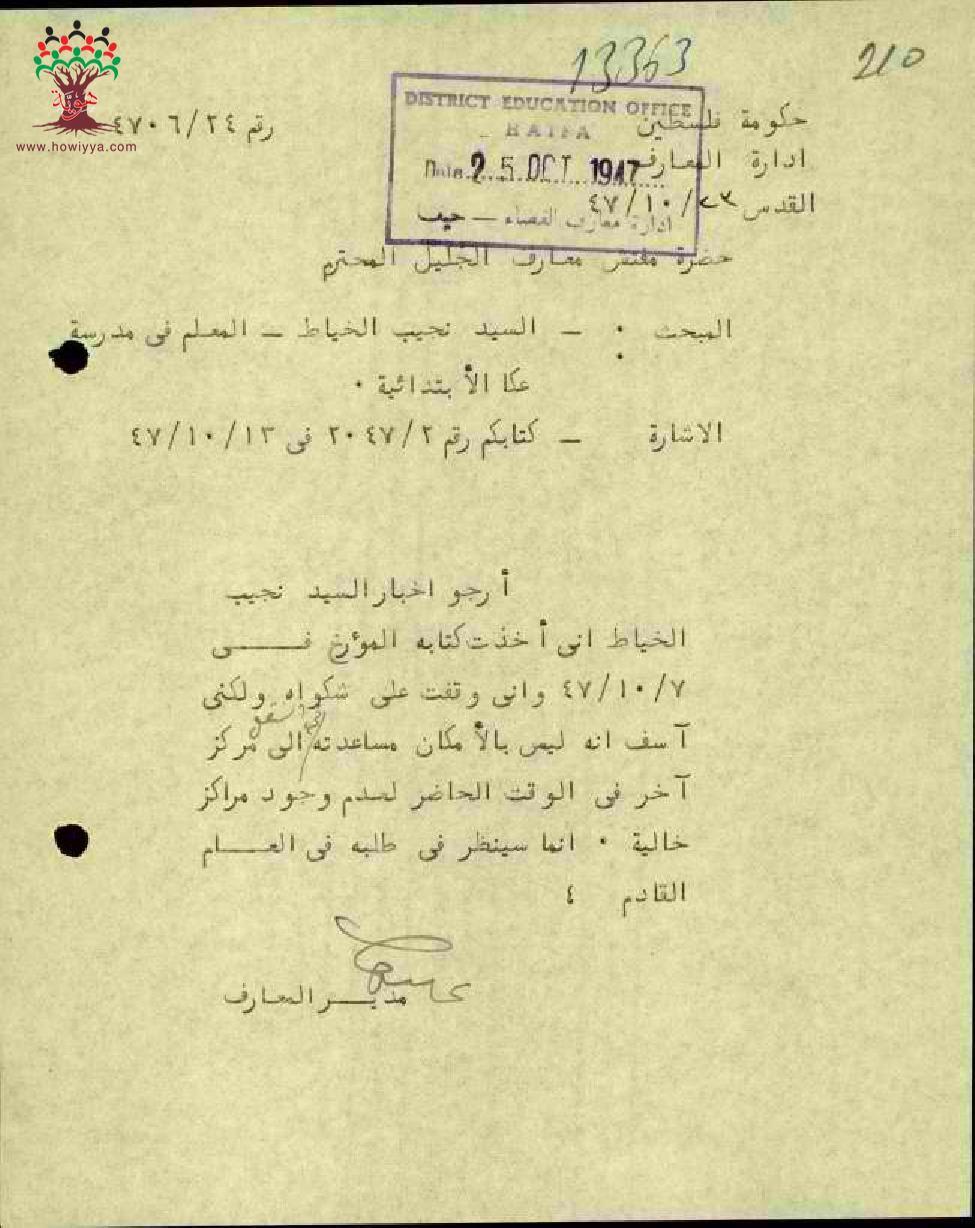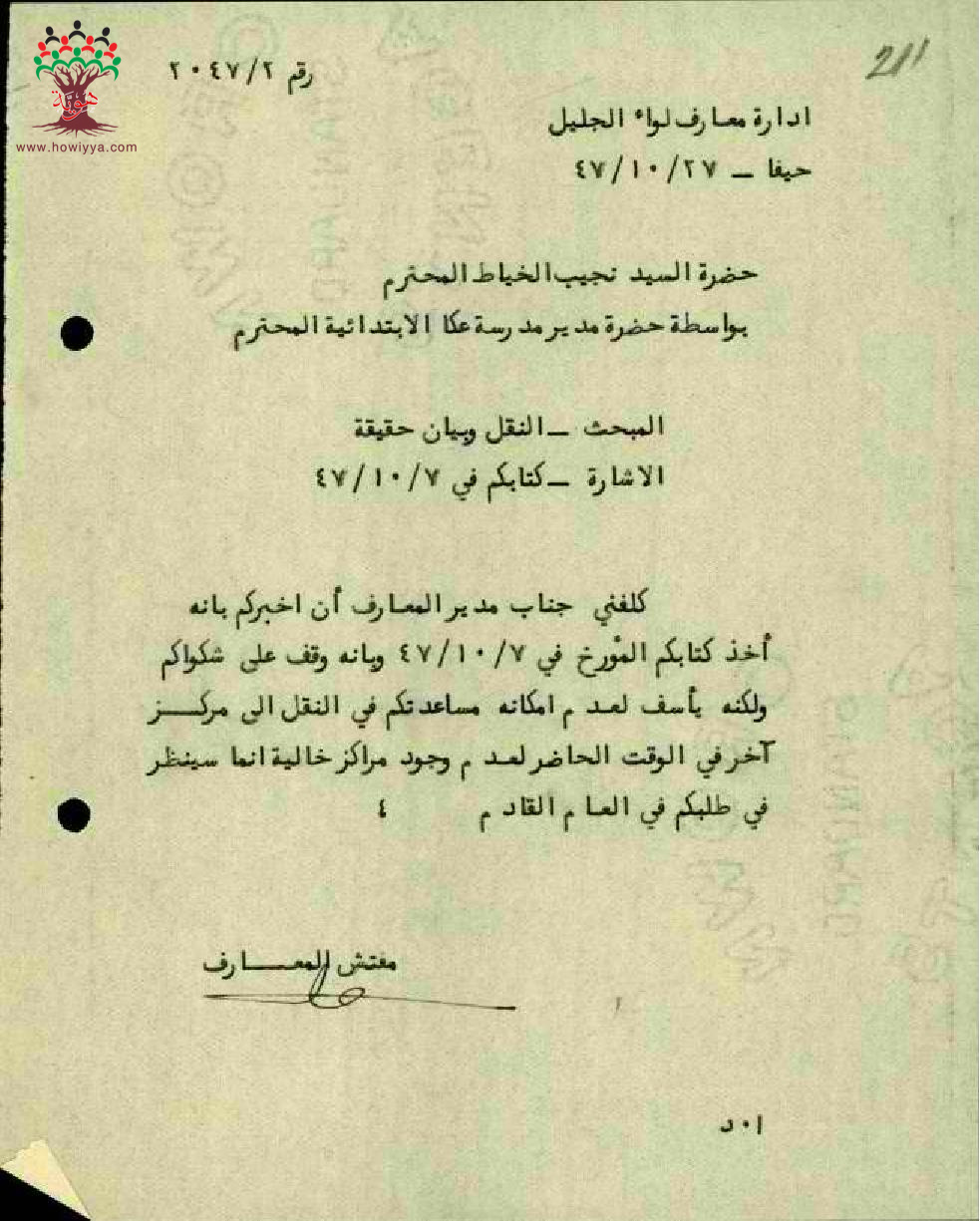 رسائل بخصوص عدم امكانية نقل المعلم نجيب الخياط بسبب عدم وجود مركز خالي