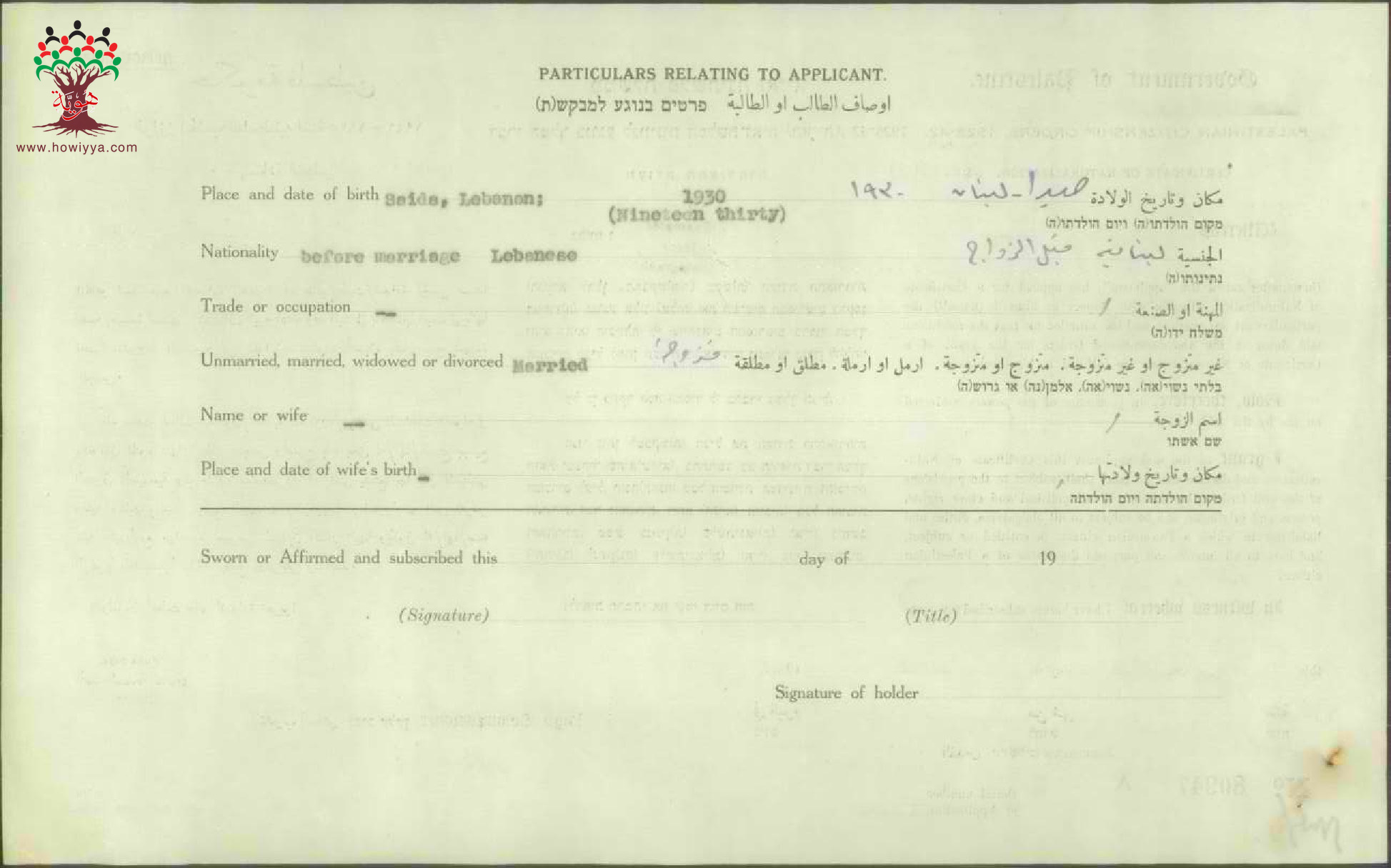 شهادة الجنسية الفلسطينية لفاطمة الحاج حسن (جرادي)