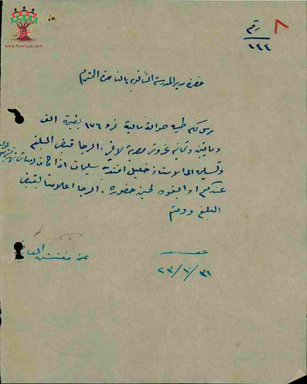 رسالة من مفتش المعارف الى مدير مدرسة الناصرة بخصوص حوالة مالية للمعلم خليل مرعب