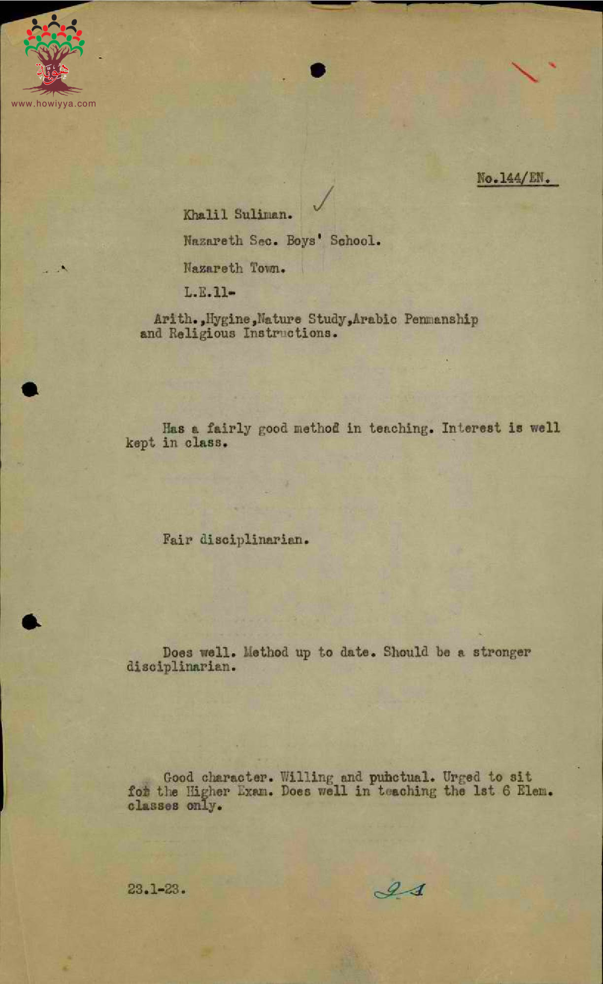 تقرير بخصوص أداء المعلم خليلمرعب في مدرسة الناصرة سنة 1923