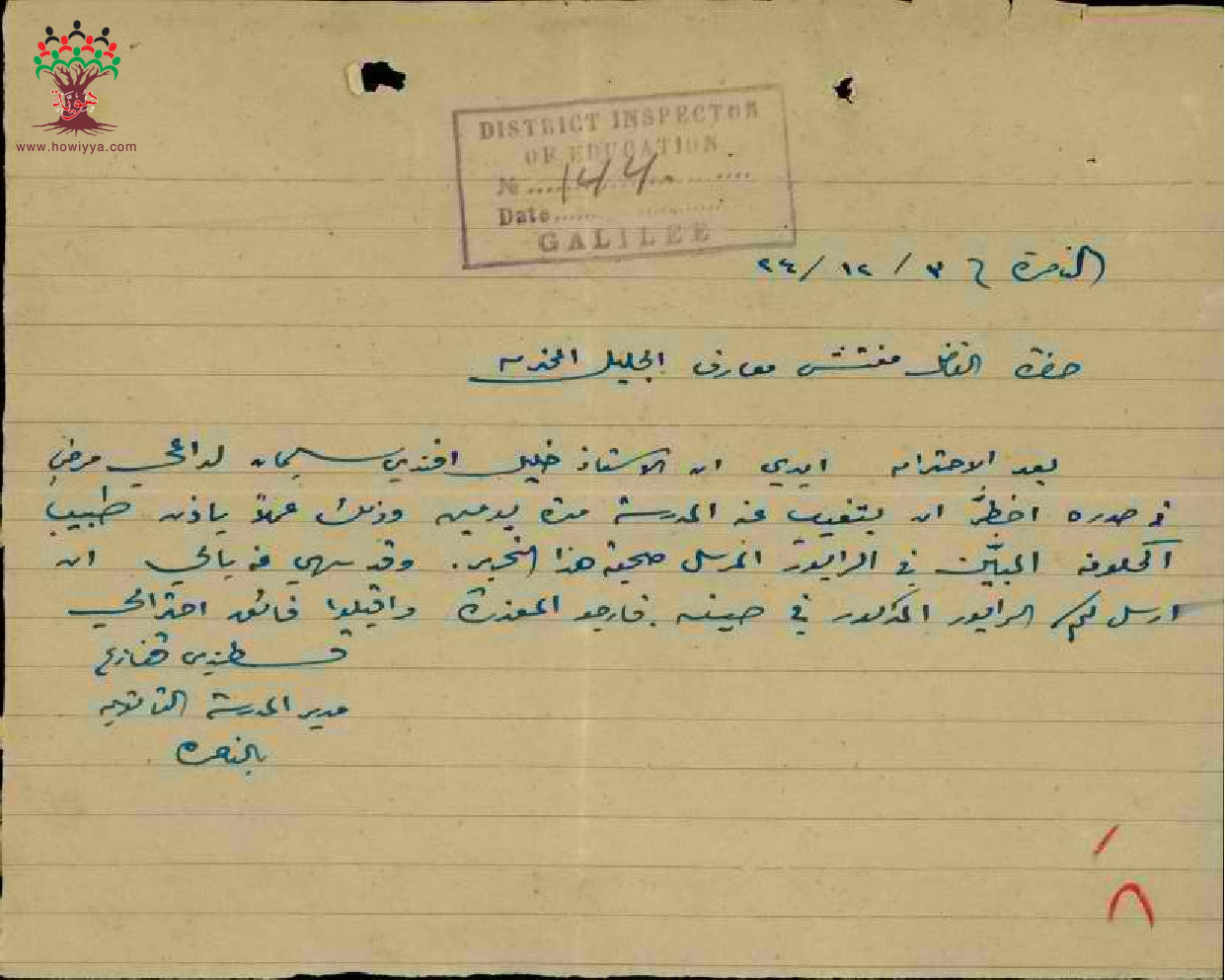 رسالة من مدير مدرسة الناصرة الى مفتش المعارف بخصوص تغيب المعلم خليل مرعب بسبب المرض