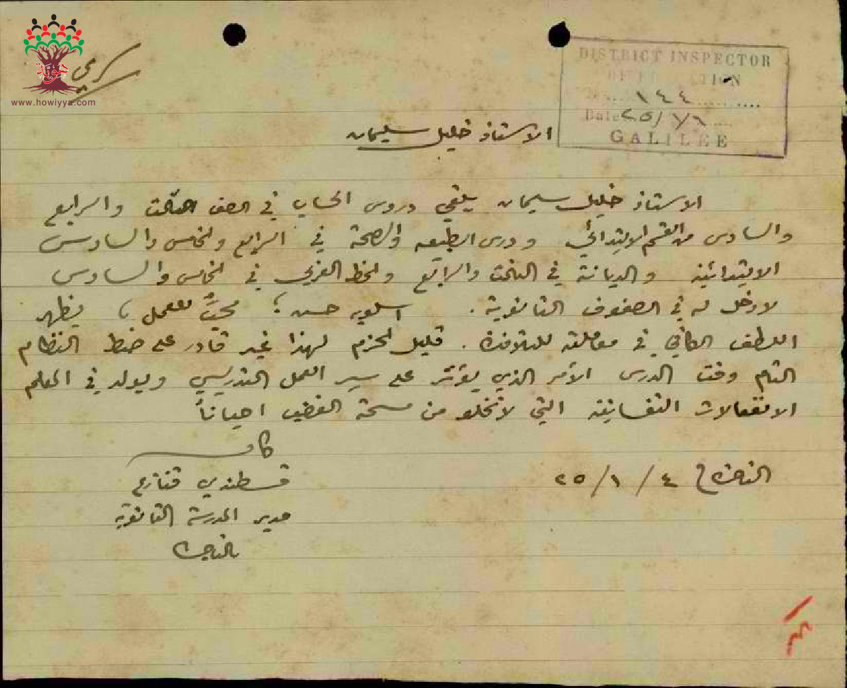 رسالة من مدير مدرسة الناصرة الى مفتش المعارف بخصوص أداء المعلم خليل مرعب