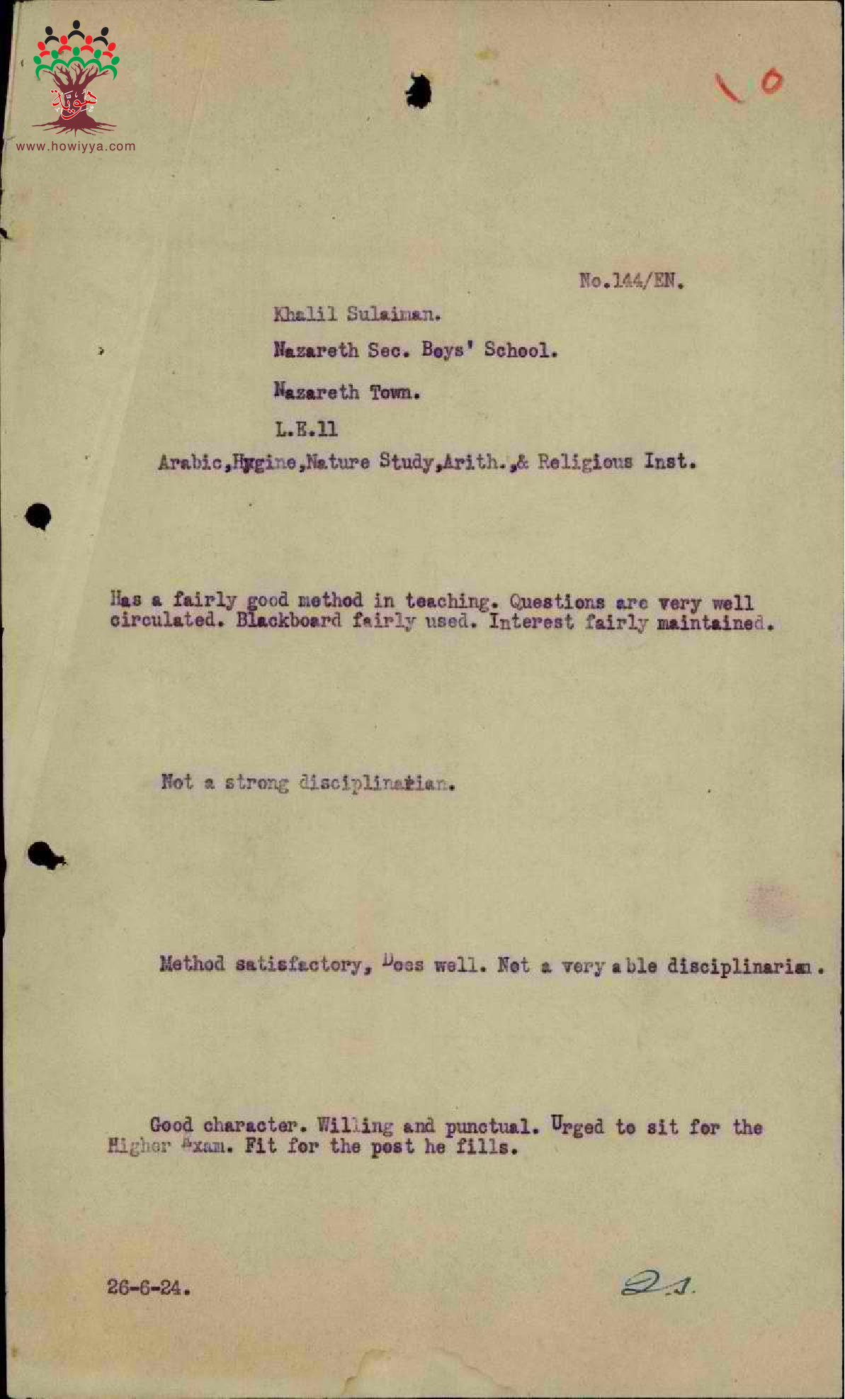 تقرير عن أداء المعلم خليل سليمان مرعب في مدرسة الناصرة سنة 1924