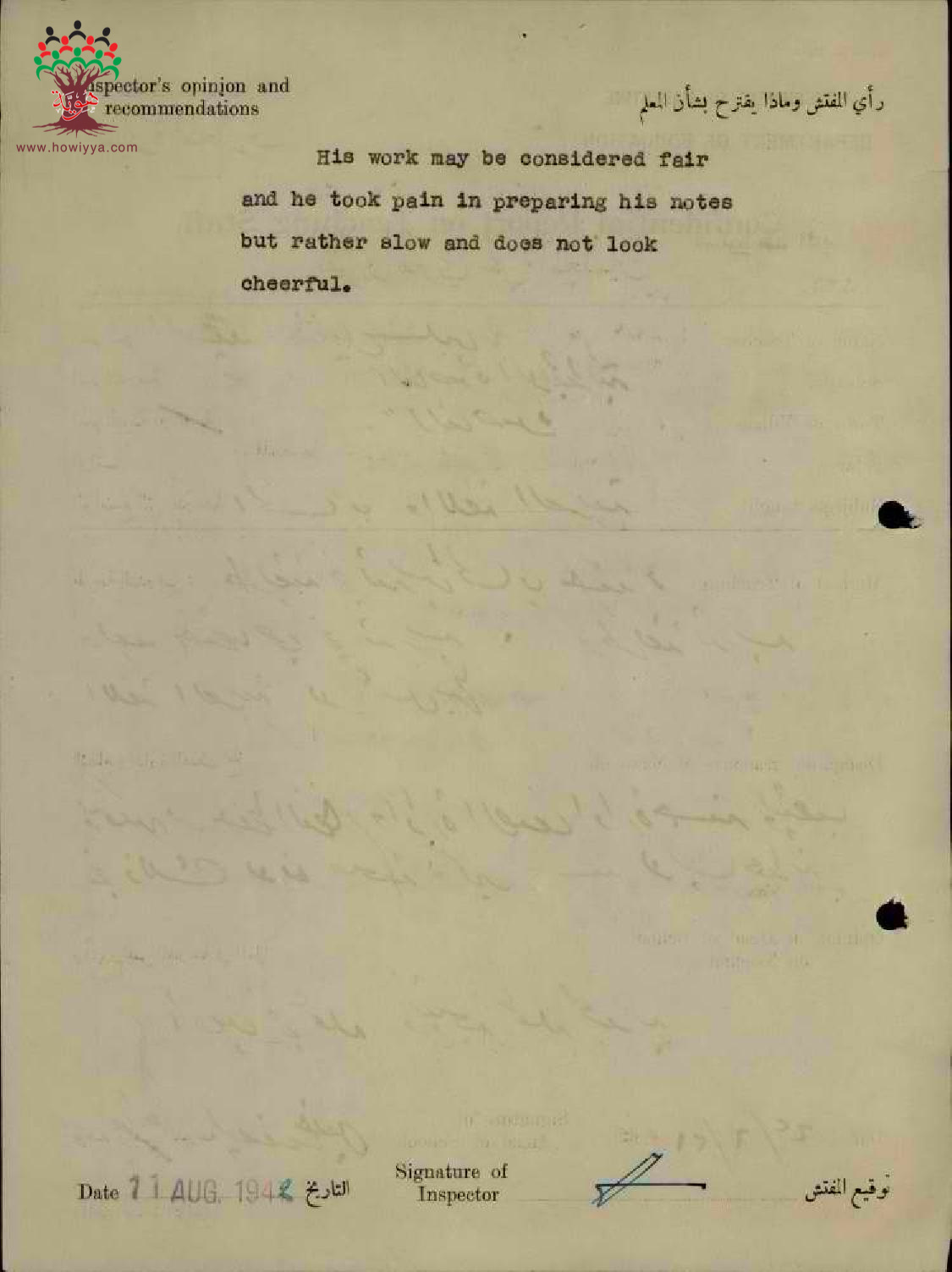 تقرير تفصيلي عن أداء المعلم خليل سليمان مرعب في مدرسة الناصرة سنة 1942