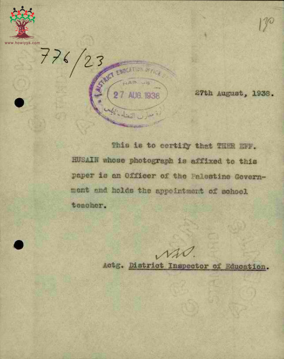شهادة من مفتش التعليم بأن المعلم طاهر حسين موظف حكومي في دائرة المعارف