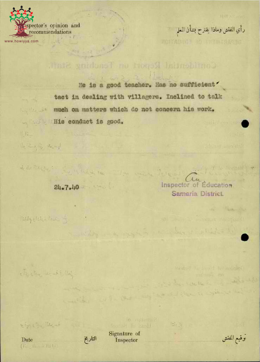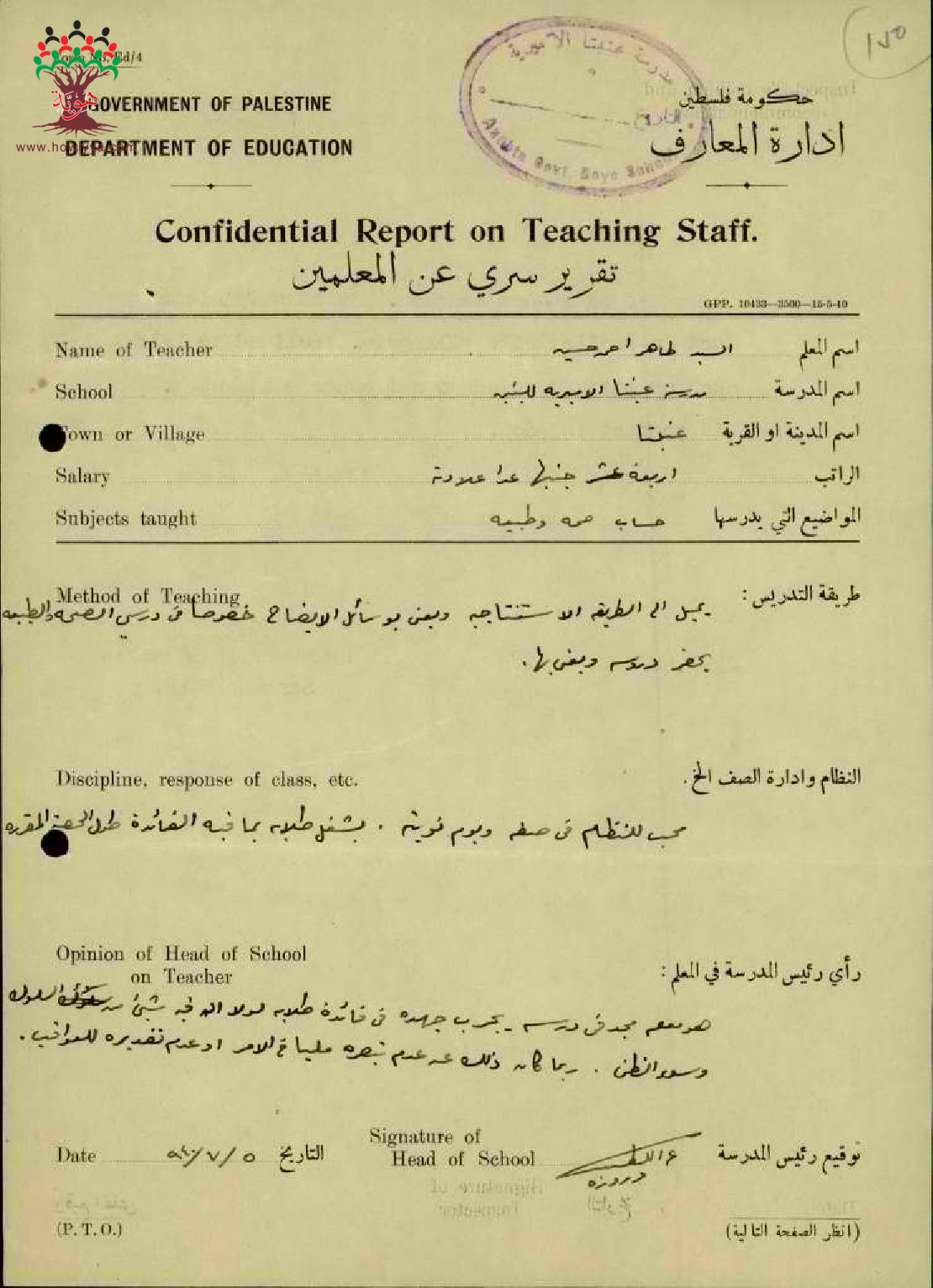تقرير تفصيلي عن أداء المعلم طاهر حسين في مدرسة عنبتا سنة 1940