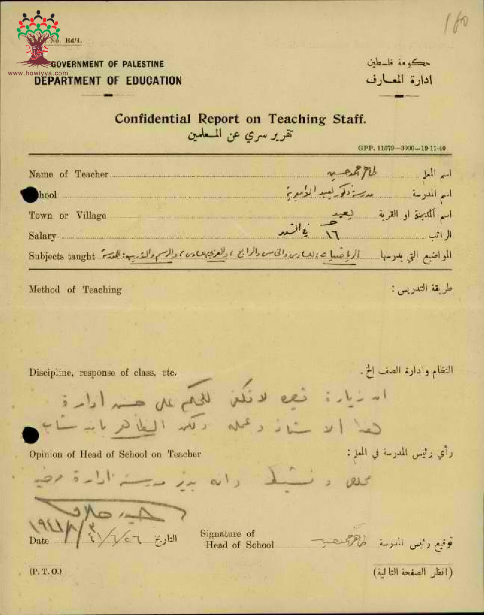 تقرير تفصيلي عن أداء المعلم طاهر حسين في مدرسة يعبد سنة 1941