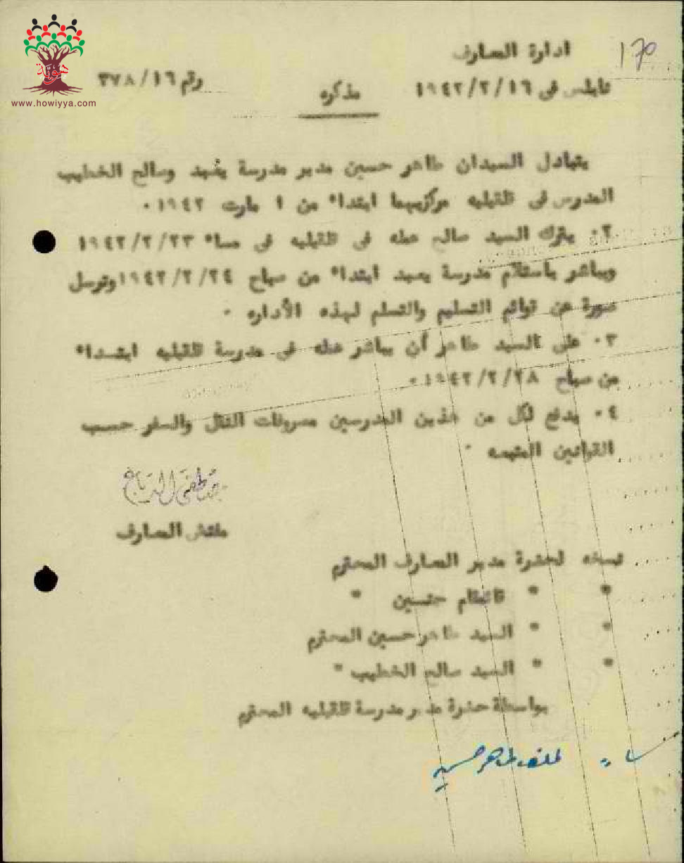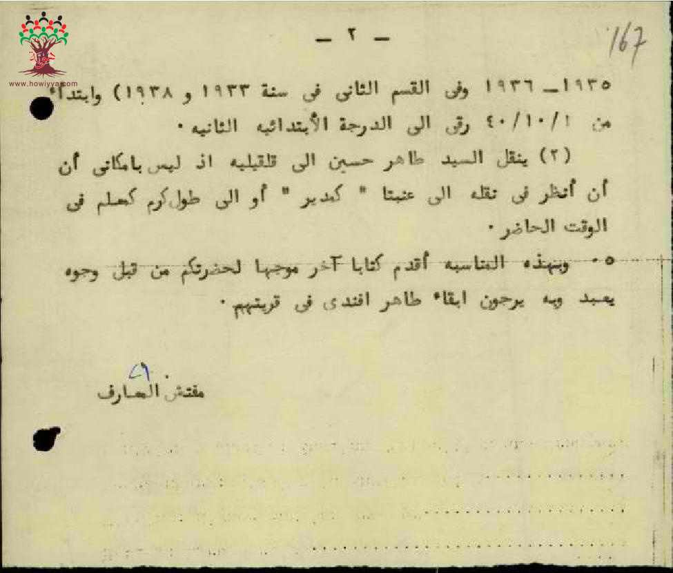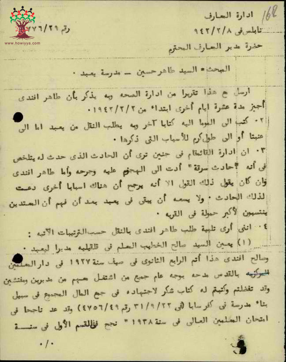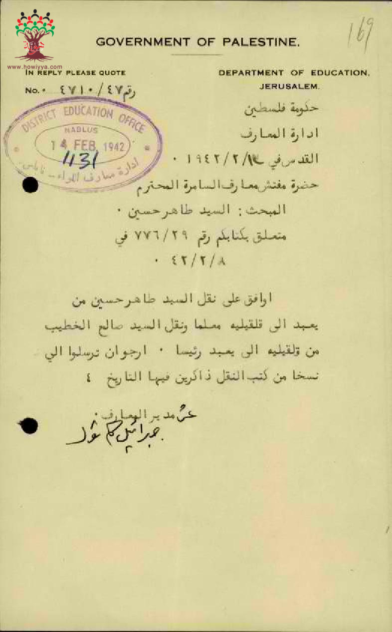 مجموعة رسائل بخصوص نقل المعلم طاهر حسين من مدرسة يعبد الى قلقيلية