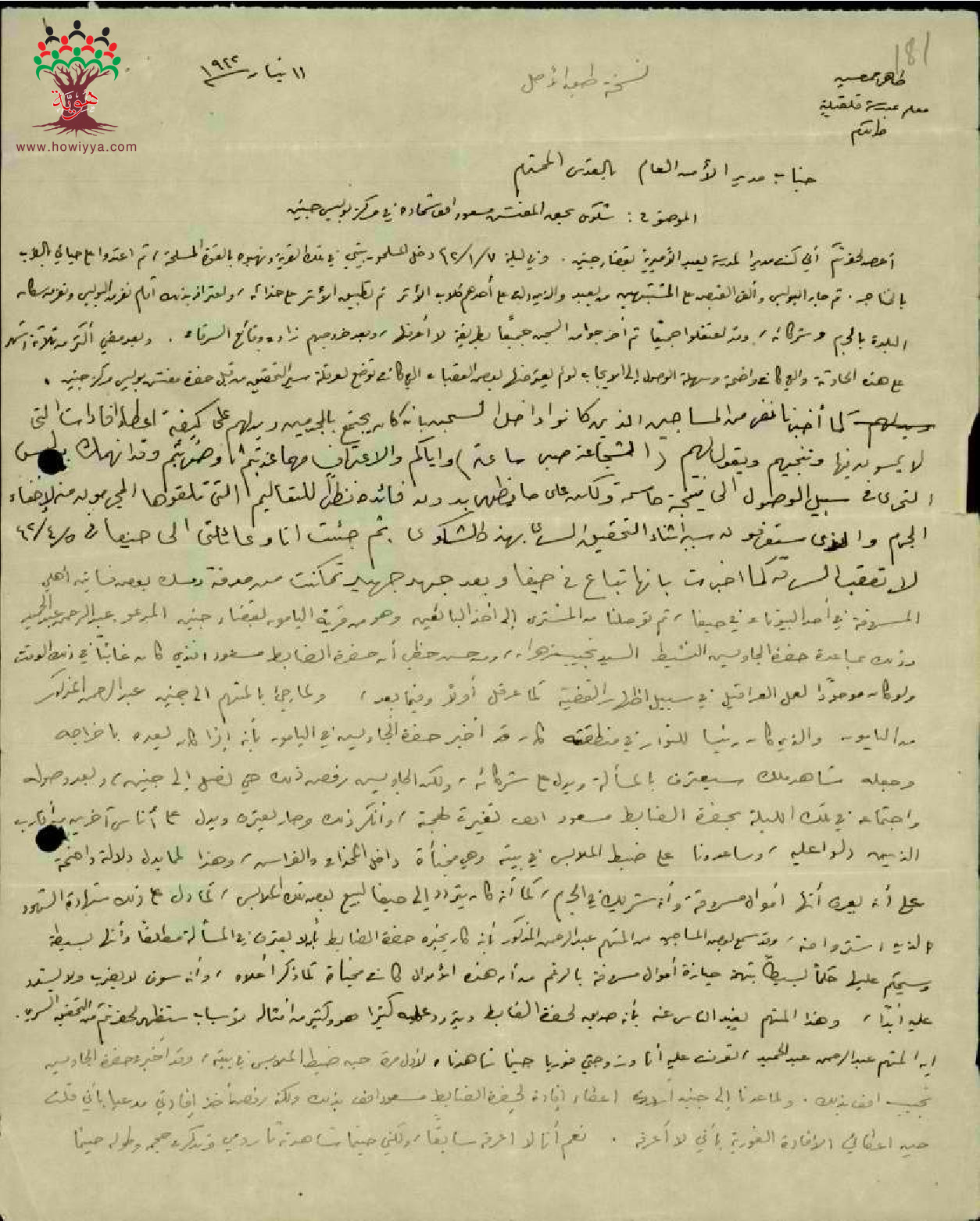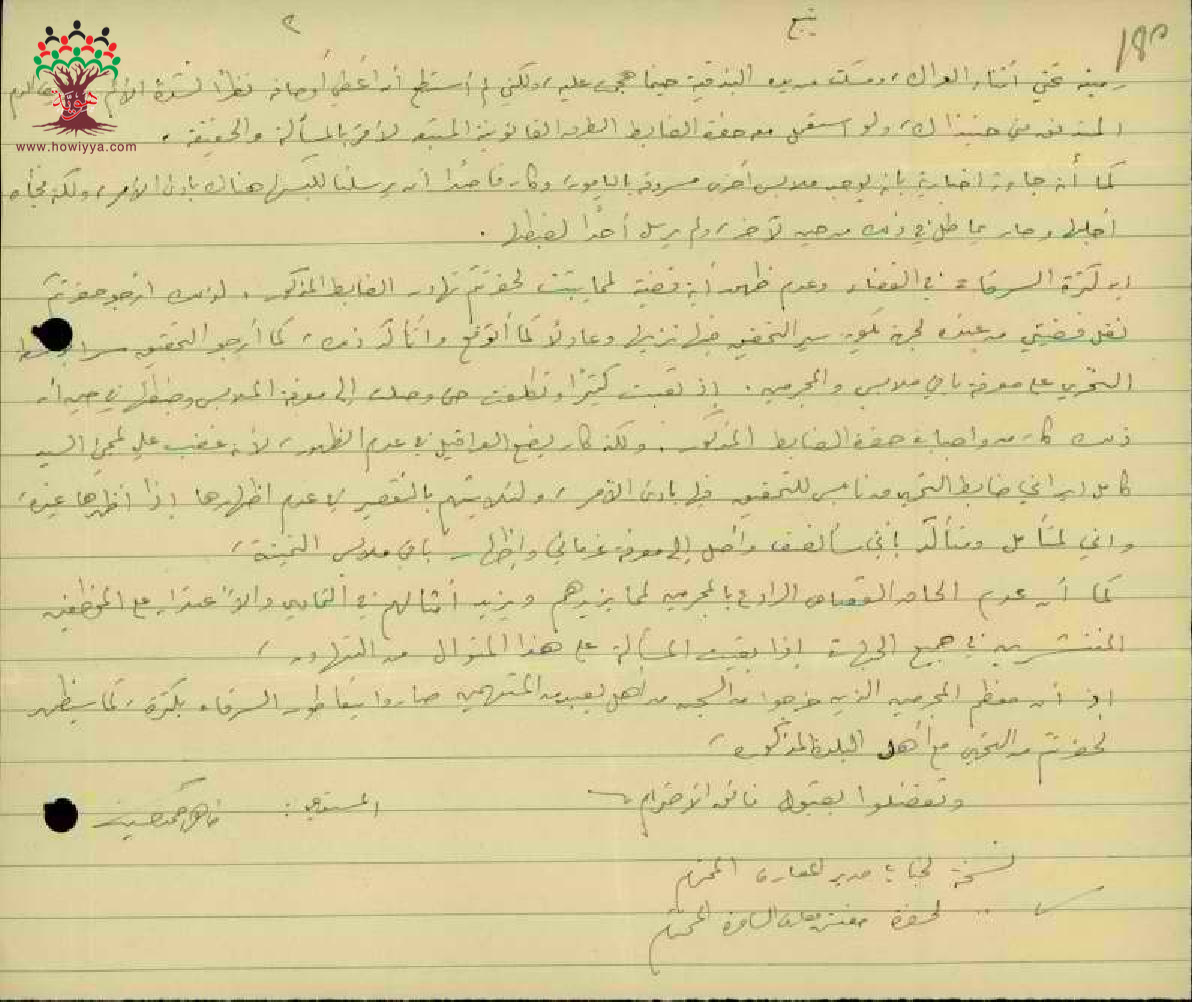 رسالة من المعلم طاهر حسين الى مفتش المعارف بخصوص قضية سرقة منزله