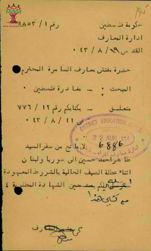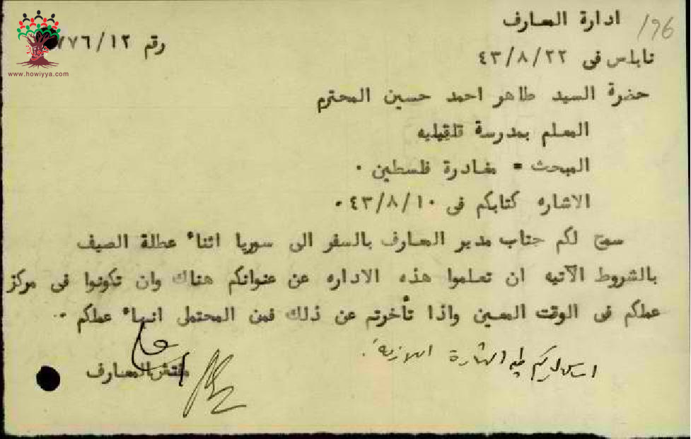 رسالة من مفتش المعارف الى المعلم طاهر حسين مرفقة بموافقة مدير المعارف على سفره خارج فلسطين خلال العطلة