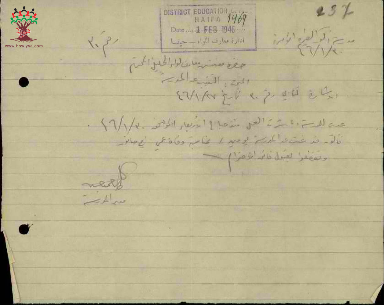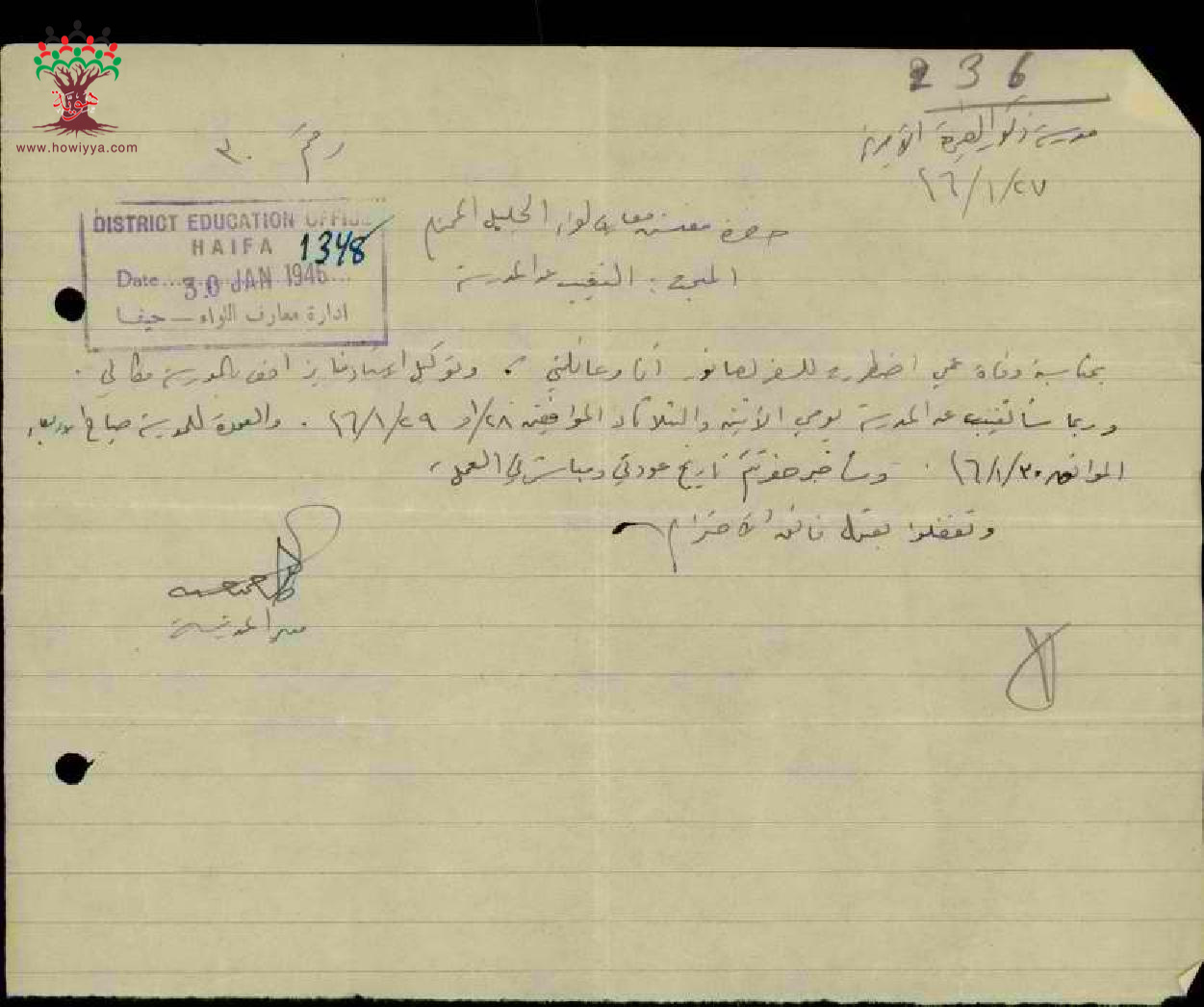 رسائل من المعلم طاهر حسين الى مفتش المعارف بخصوص تغيبه بسبب وفاة عمه وعودته الى العمل