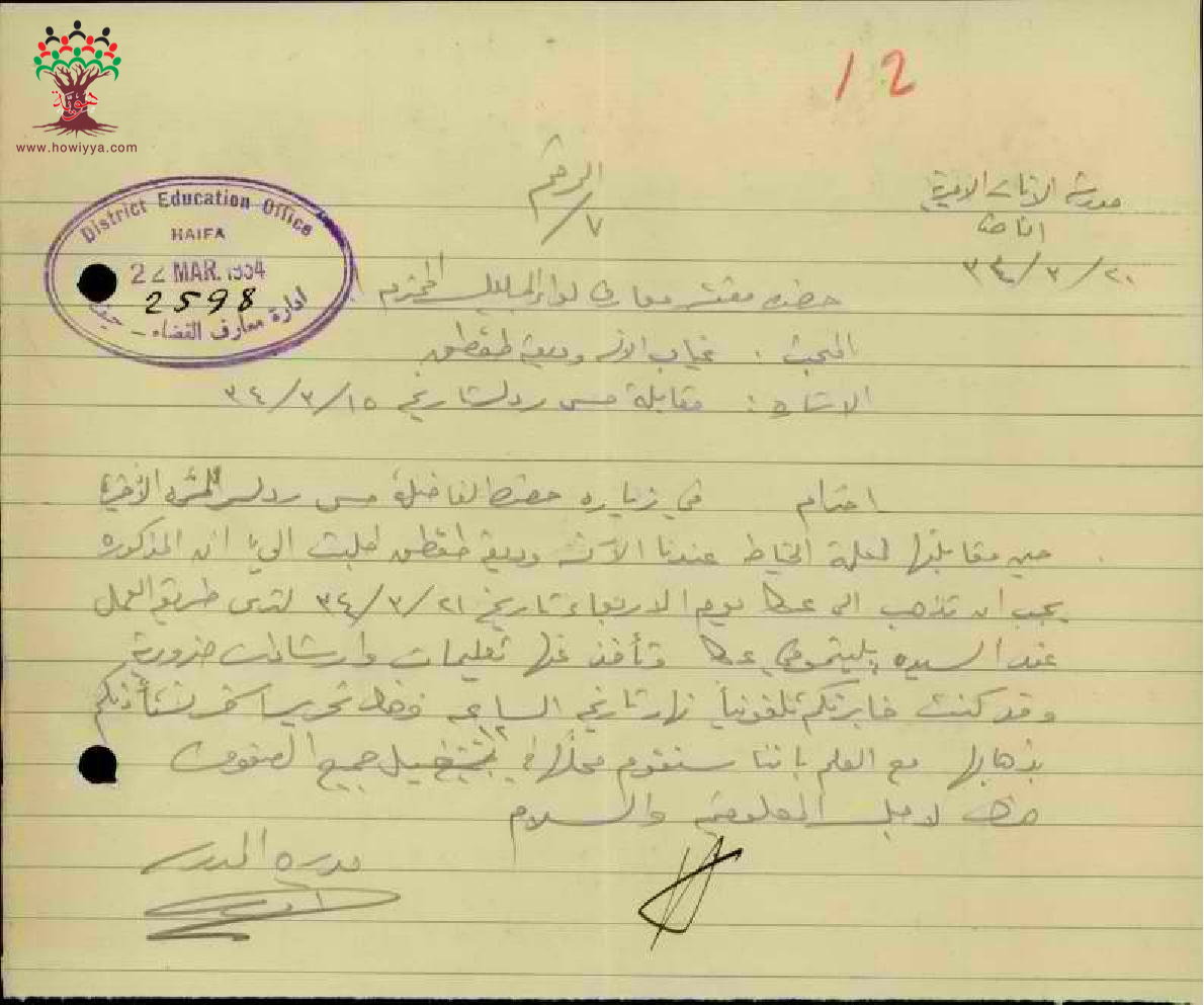 رسالة من مديرة مدرسة الناصرة الى مفتش المعارف بخصوص اذن بالتغيب للمعلمة وديعة طقطق للتوجه الى عكا