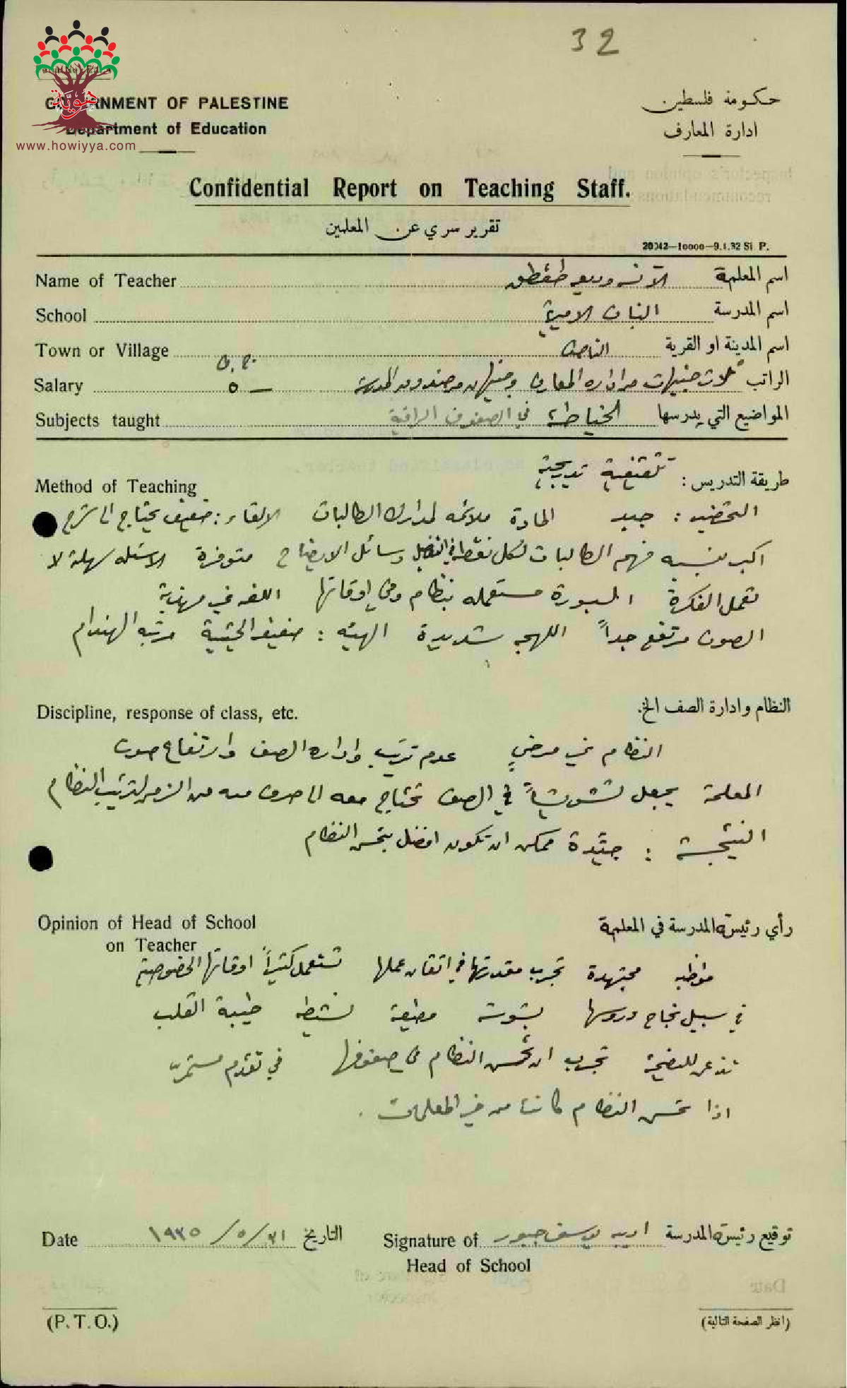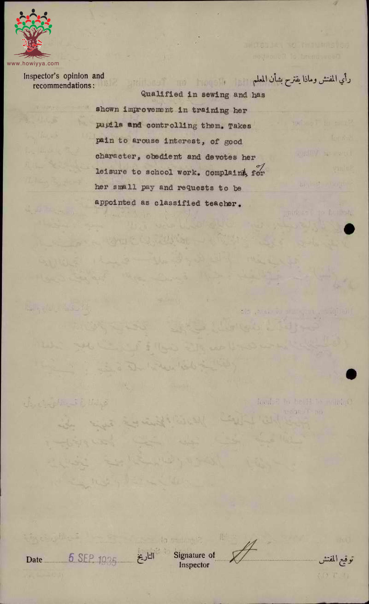 تقرير تفصيلي عن أداء المعلمة وديعة طقطق في مدرسة الناصرة للبنات سنة 1935