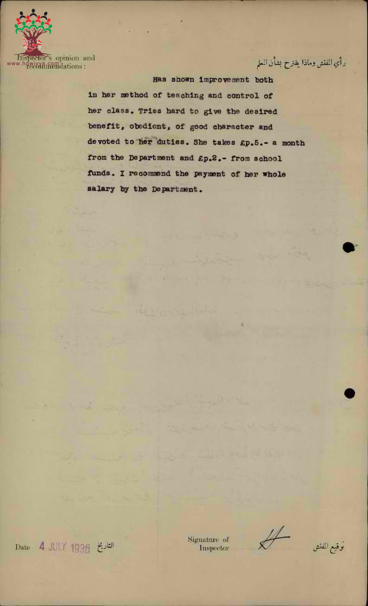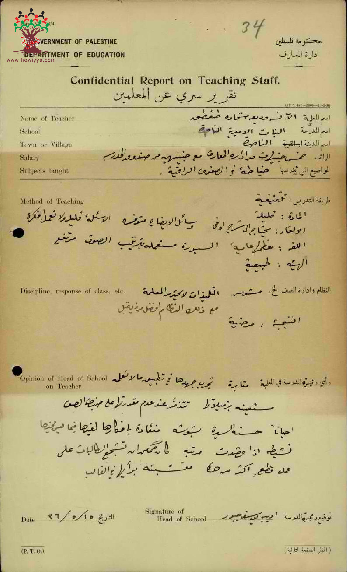 تقرير تفصيلي عن أداء المعلمة وديعة طقطق في مدرسة الناصرة للبنات سنة 1936